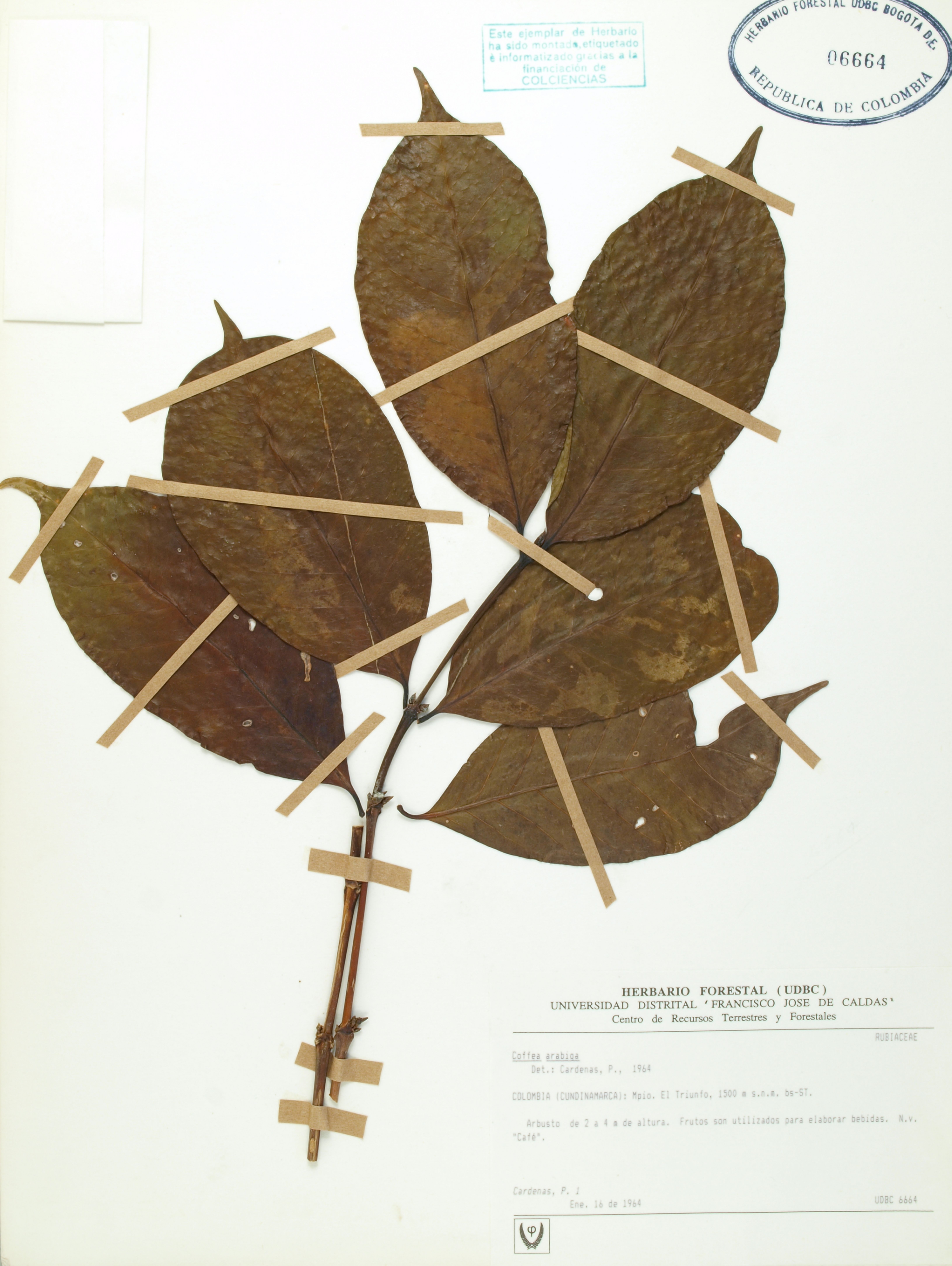 Fotografía del ejemplar Cárdenas, P. 1, determinado como Coffea arabica en el año 1964