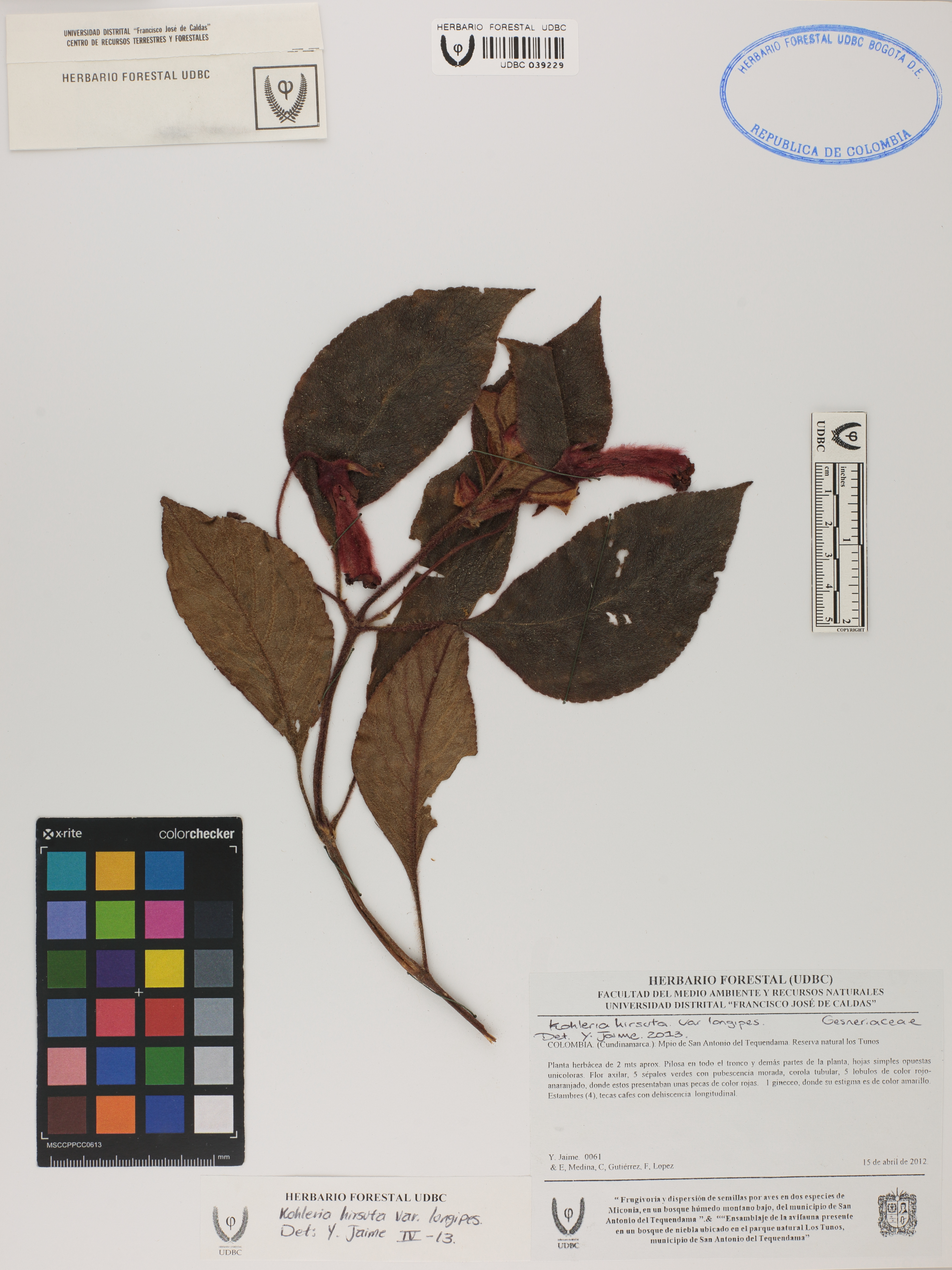Fotografía del ejemplar Jaime, Y. 61, determinado como Kohleria hirsuta en el año 2013