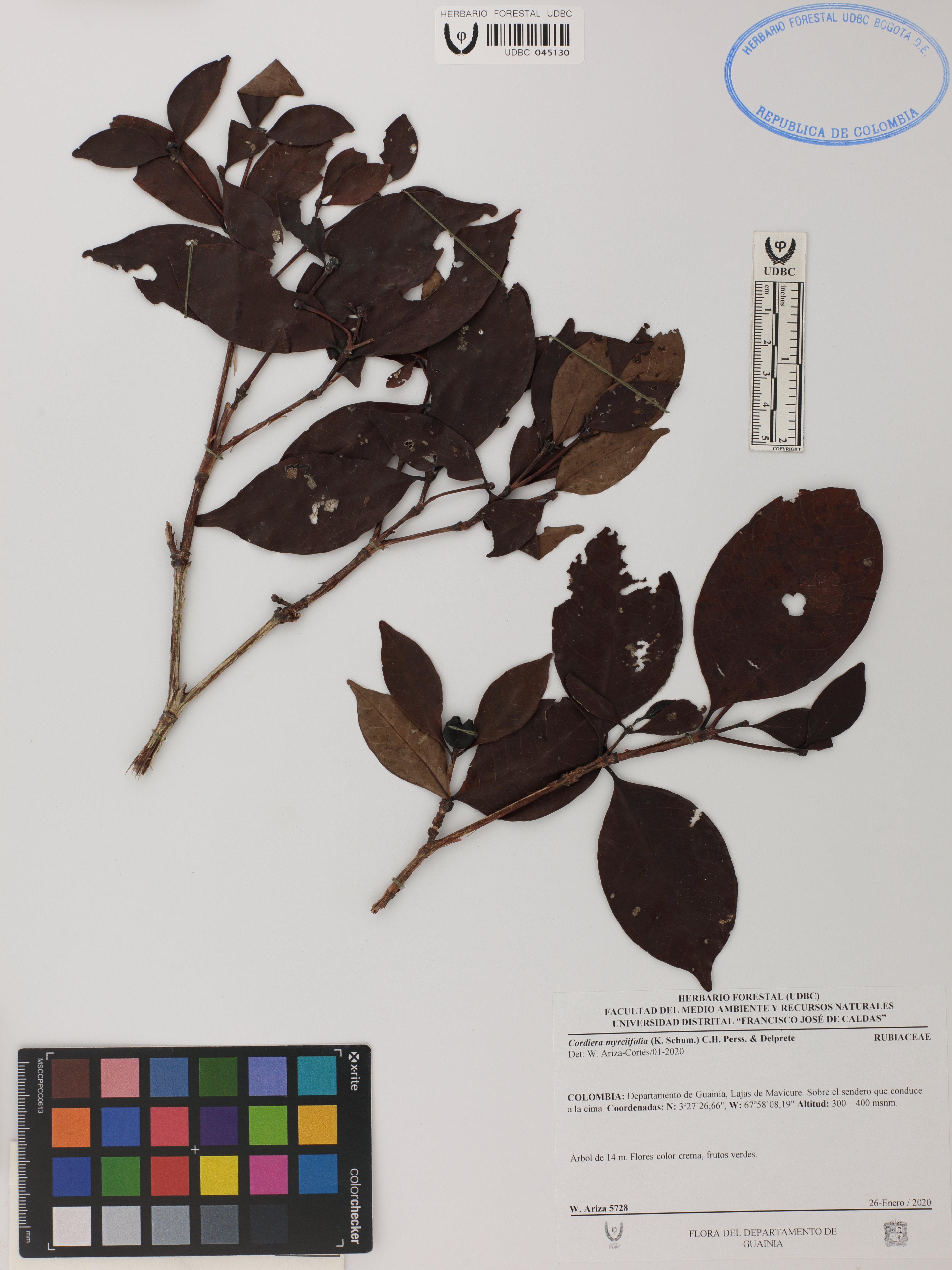 Fotografía del ejemplar Ariza-Cortés, W. 5728, determinado como Cordiera myrciifolia en el año 2020