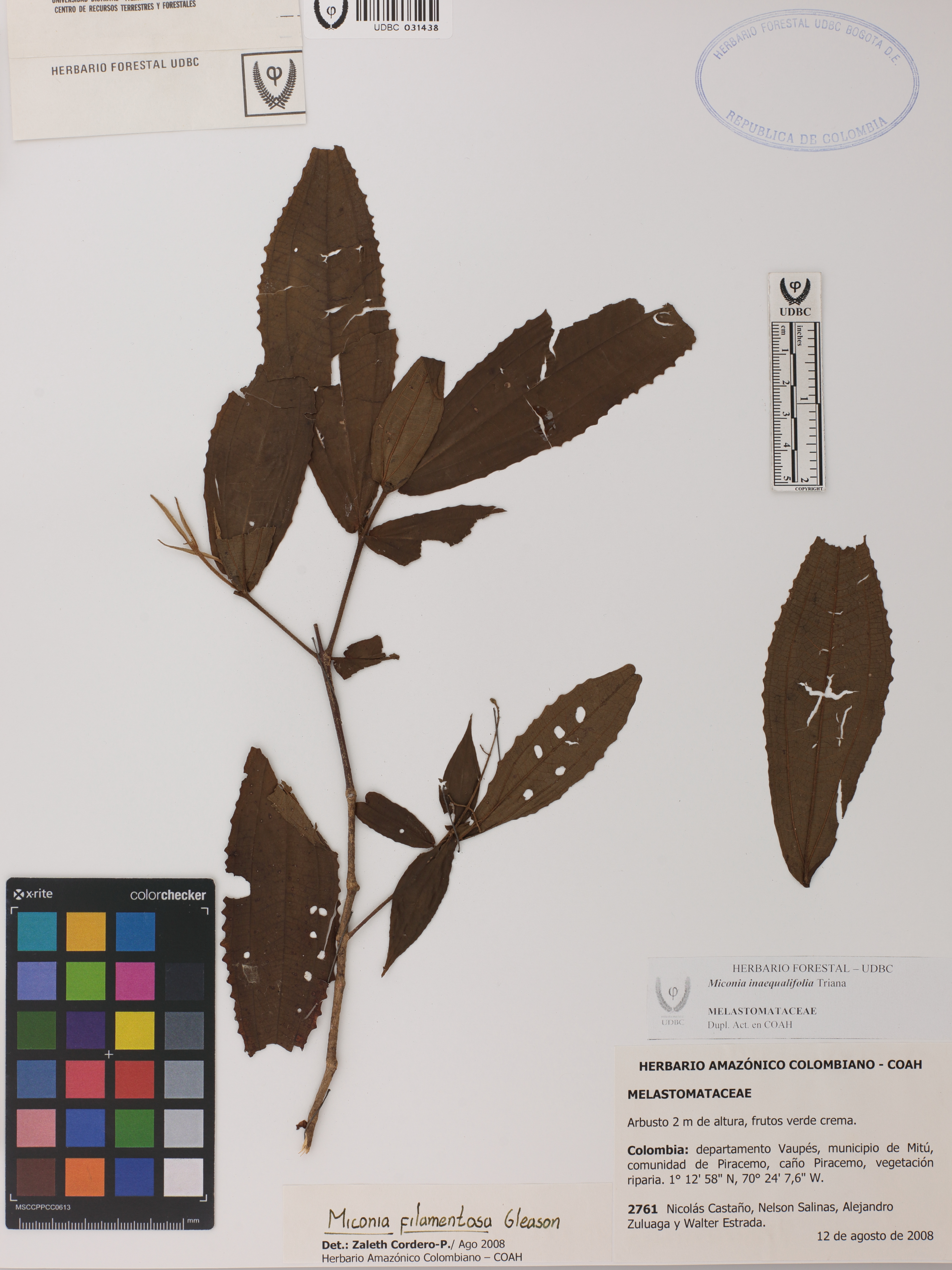 Fotografía del ejemplar Castaño, N. 2761, determinado como Miconia inaequalifolia en el año 2008