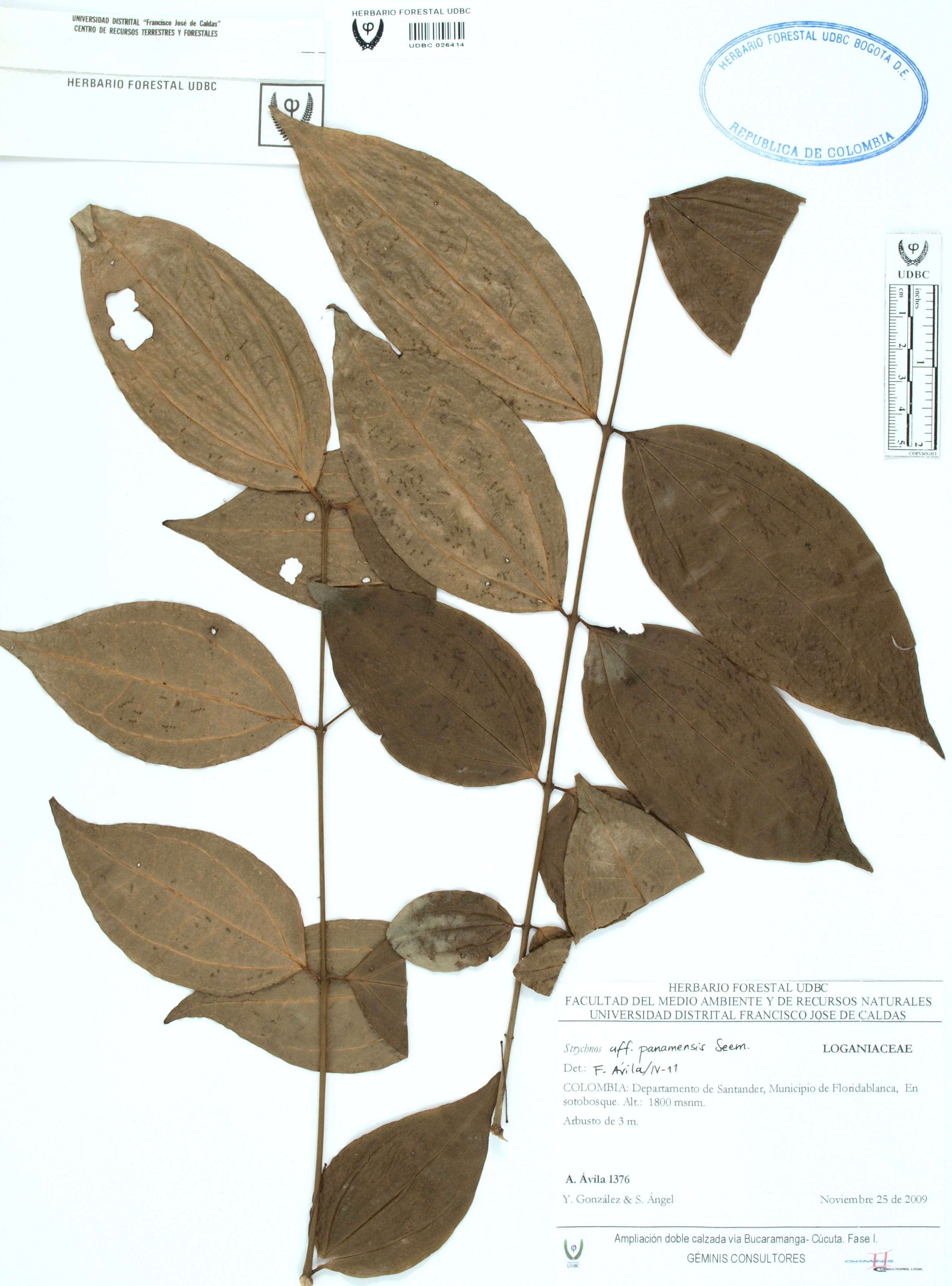 Fotografía del ejemplar Ávila, F. 1376, determinado como Strychnos panamensis en el año 2011