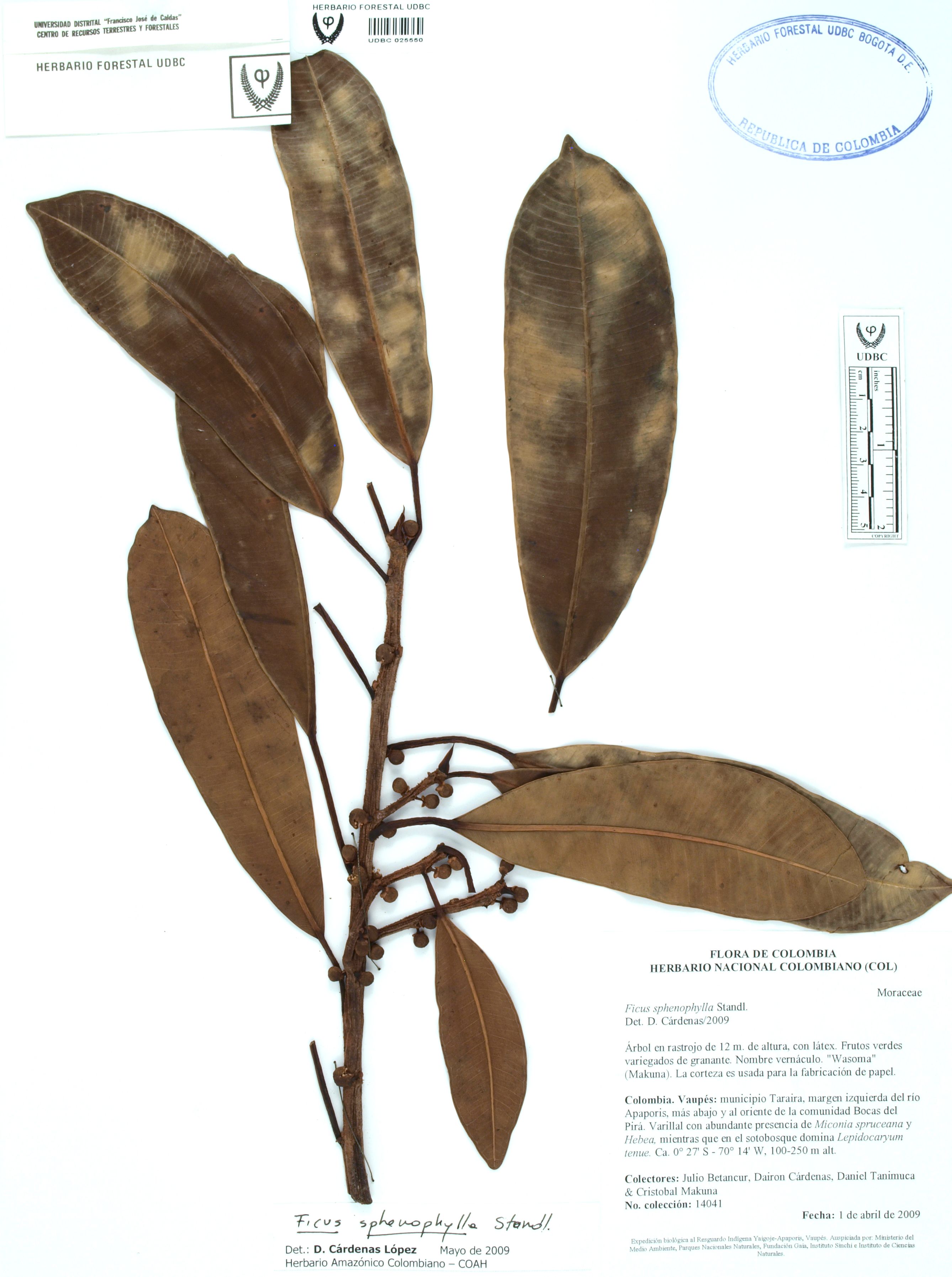 Fotografía del ejemplar Betancur, J. 14041, determinado como Ficus sphenophylla en el año 2009