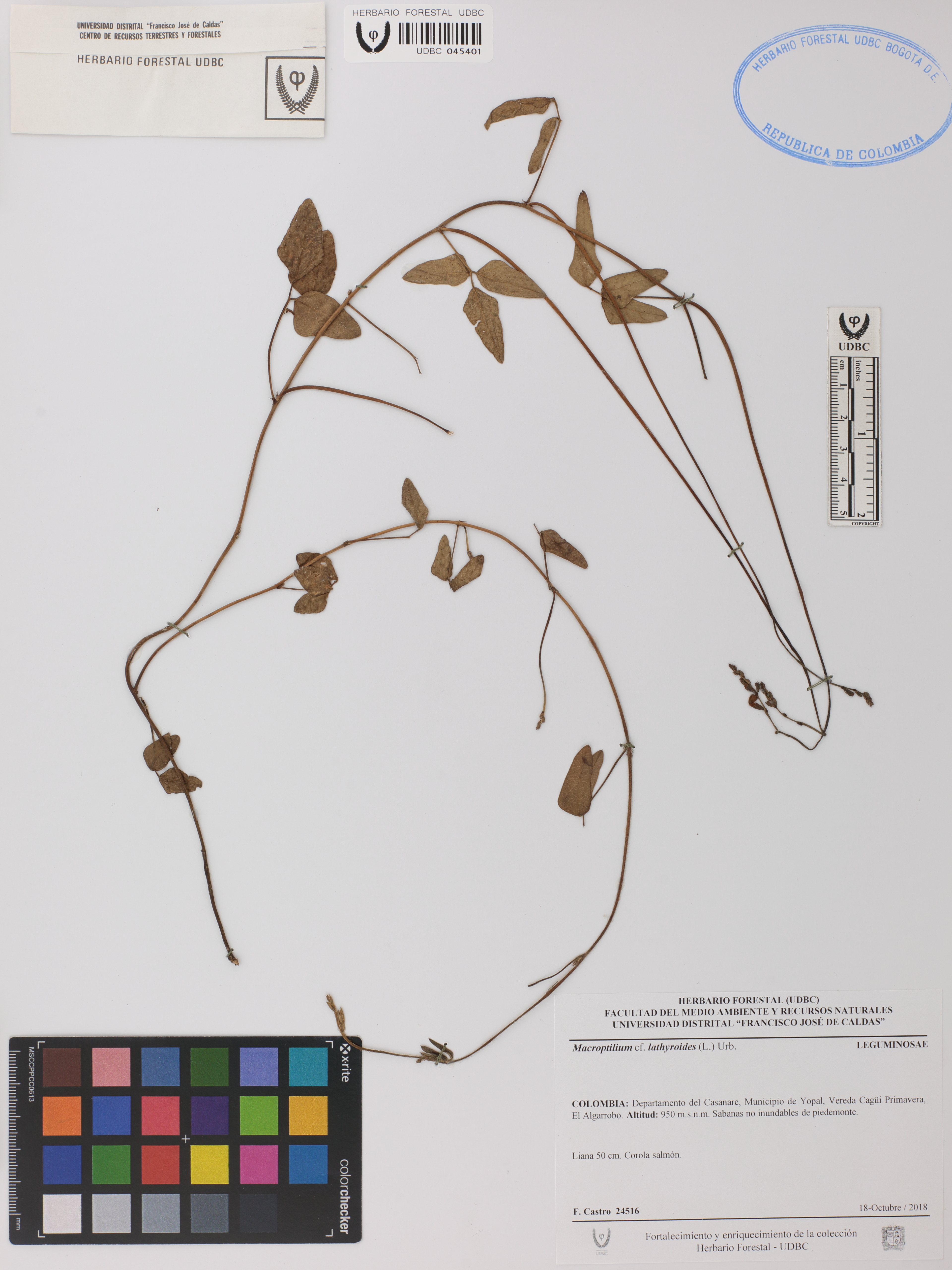 Fotografía del ejemplar Castro, F. 24516, determinado como Macroptilium lathyroides en el año 2018