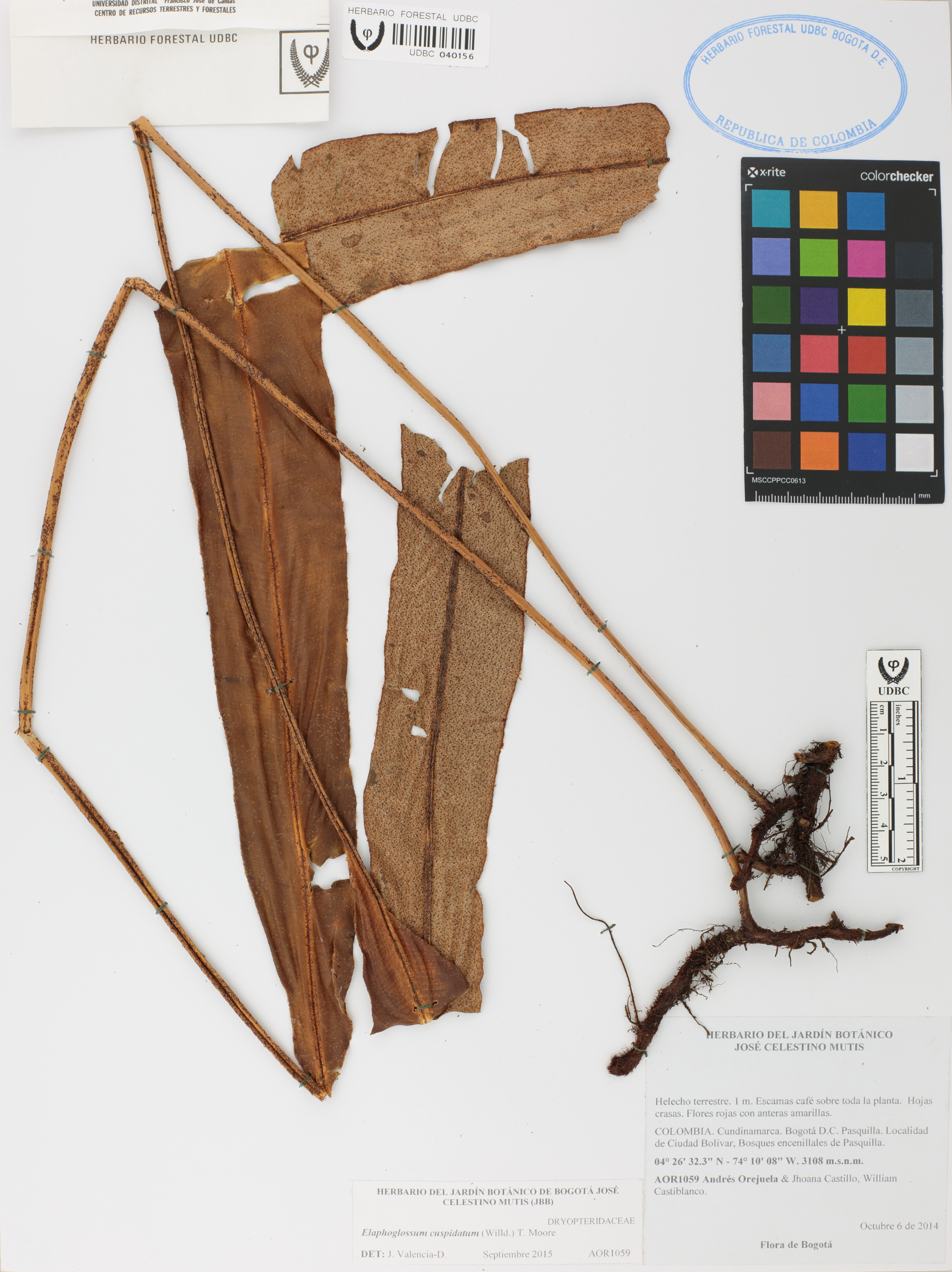 Fotografía del ejemplar Orejuela, A. 1059, determinado como Elaphoglossum cuspidatum en el año 2015