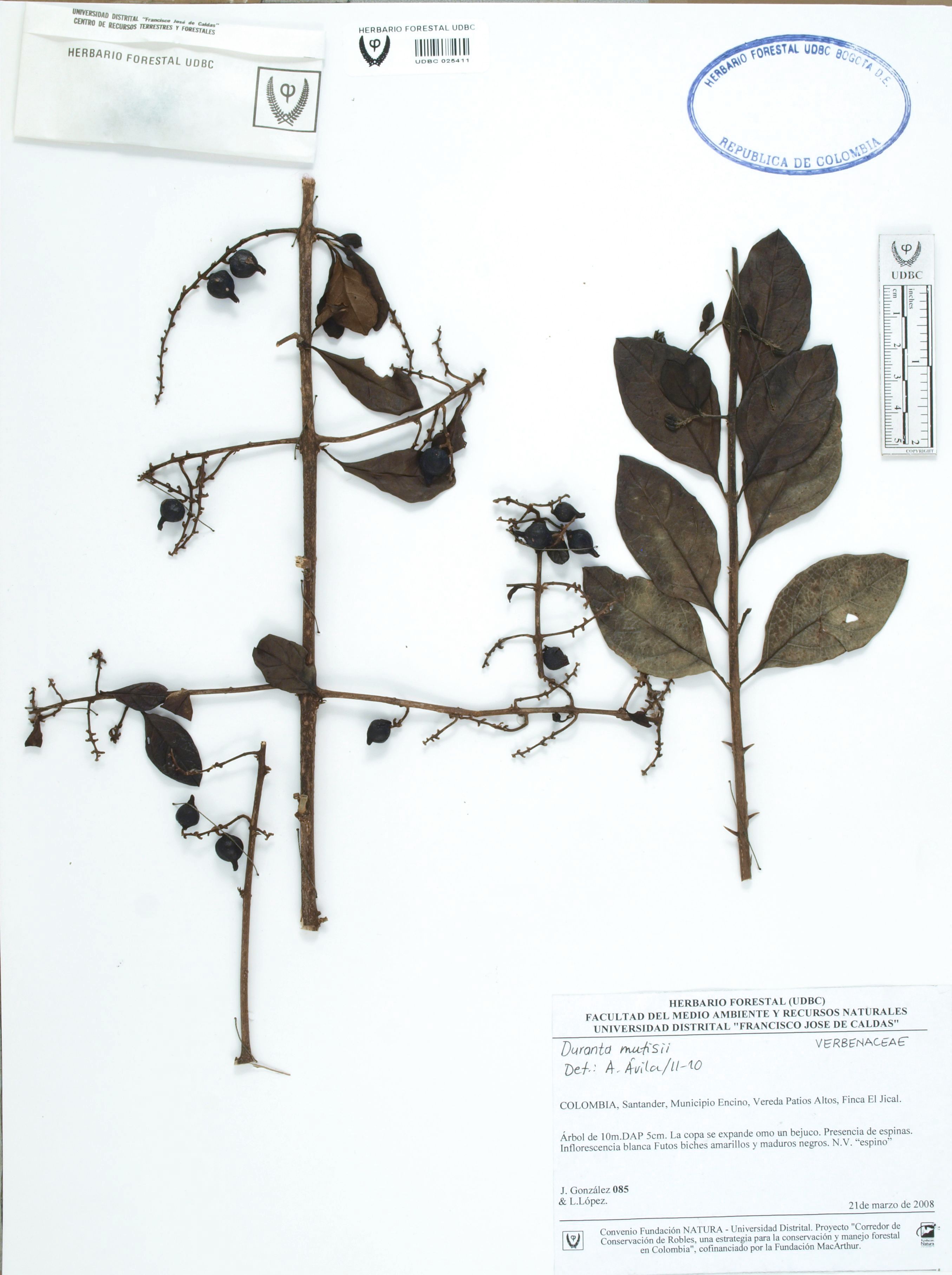 Fotografía del ejemplar González, J. 85, determinado como Duranta mutisii en el año 2010