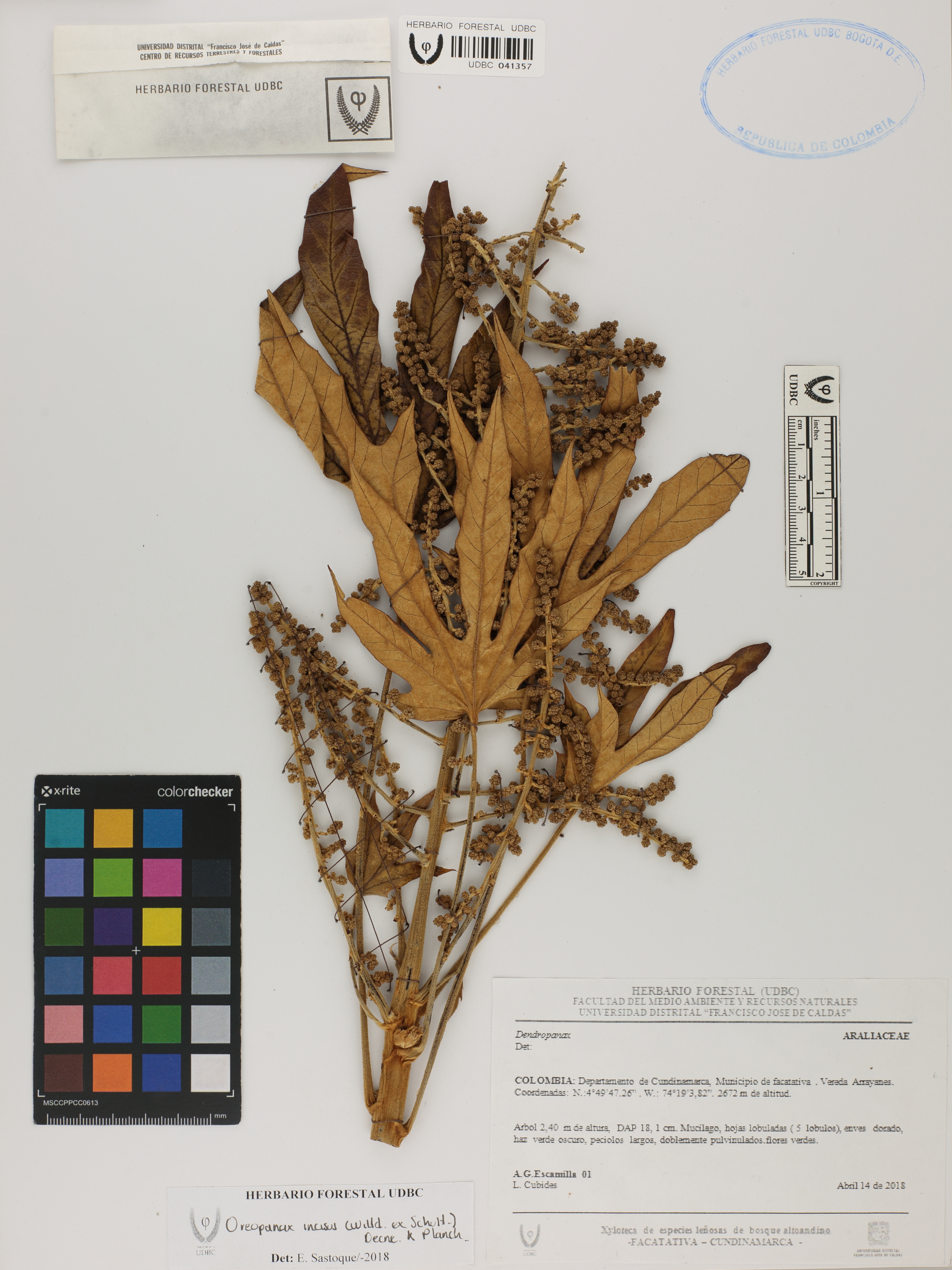 Fotografía del ejemplar Escamilla, A. 1, determinado como Oreopanax incisus en el año 2018
