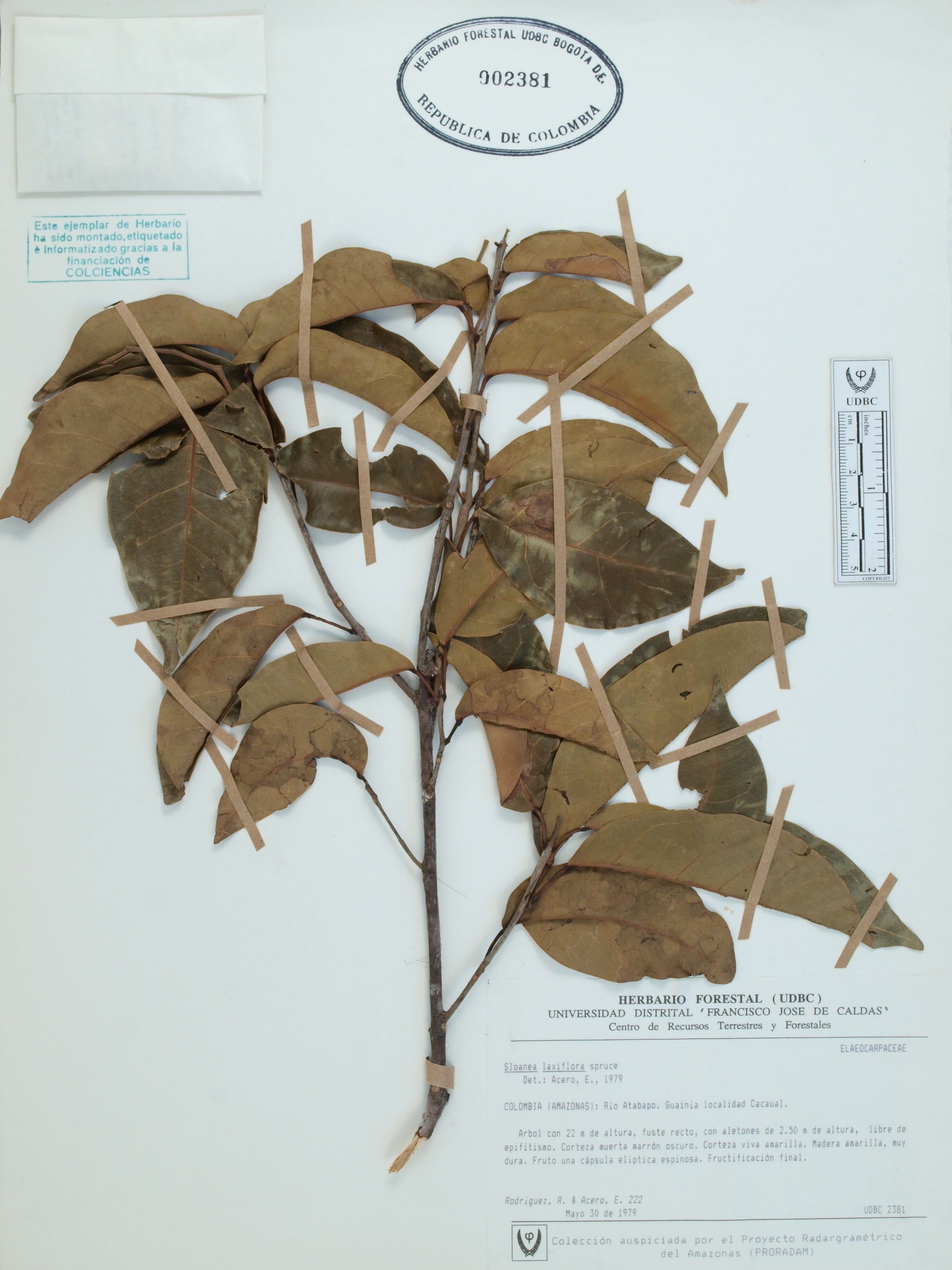 Fotografía del ejemplar Rodríguez, R. 222, determinado como Sloanea laxiflora en el año 1979