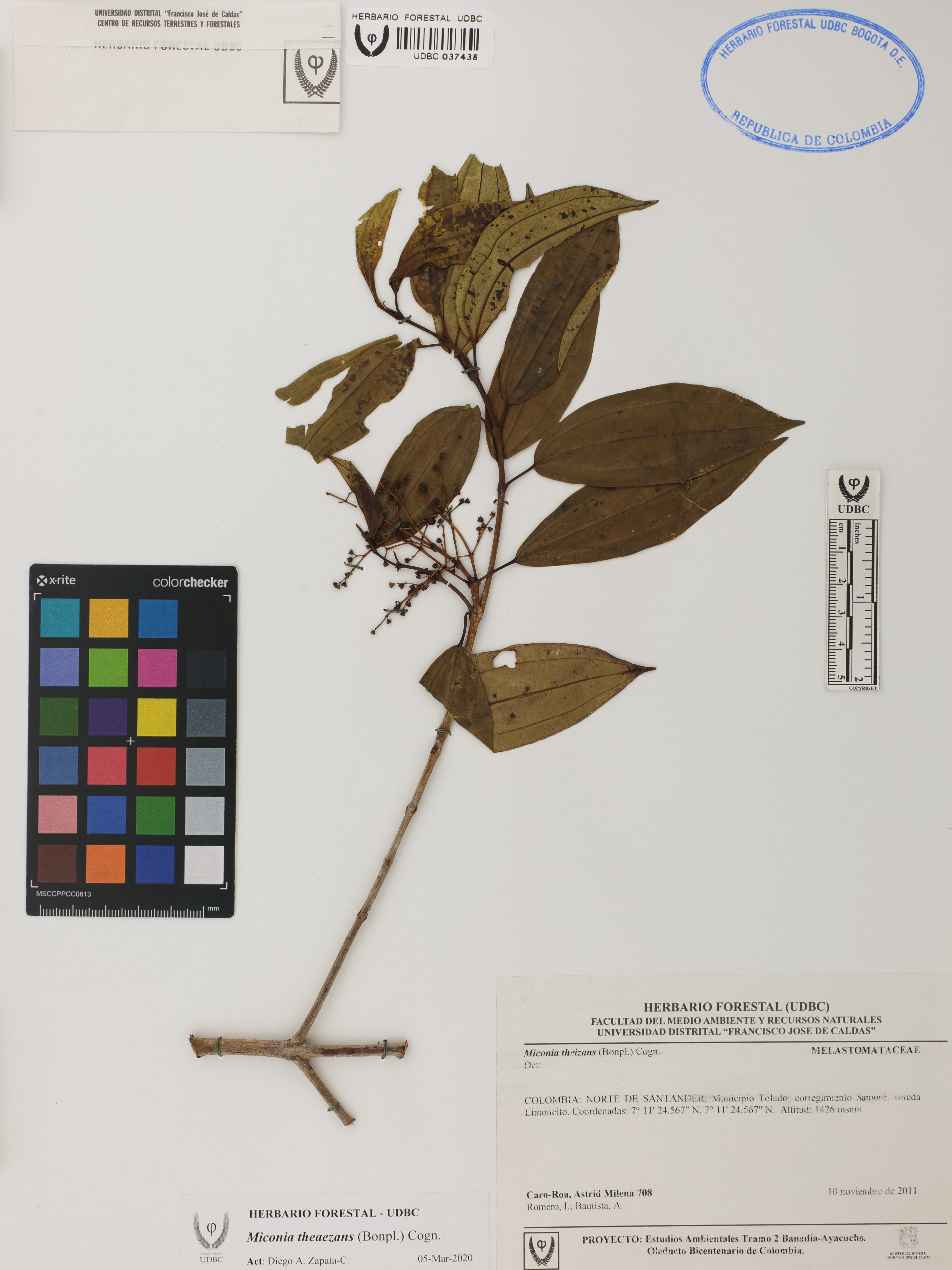 Fotografía del ejemplar Caro-Roa, A. 708, determinado como Miconia theaezans en el año 2011