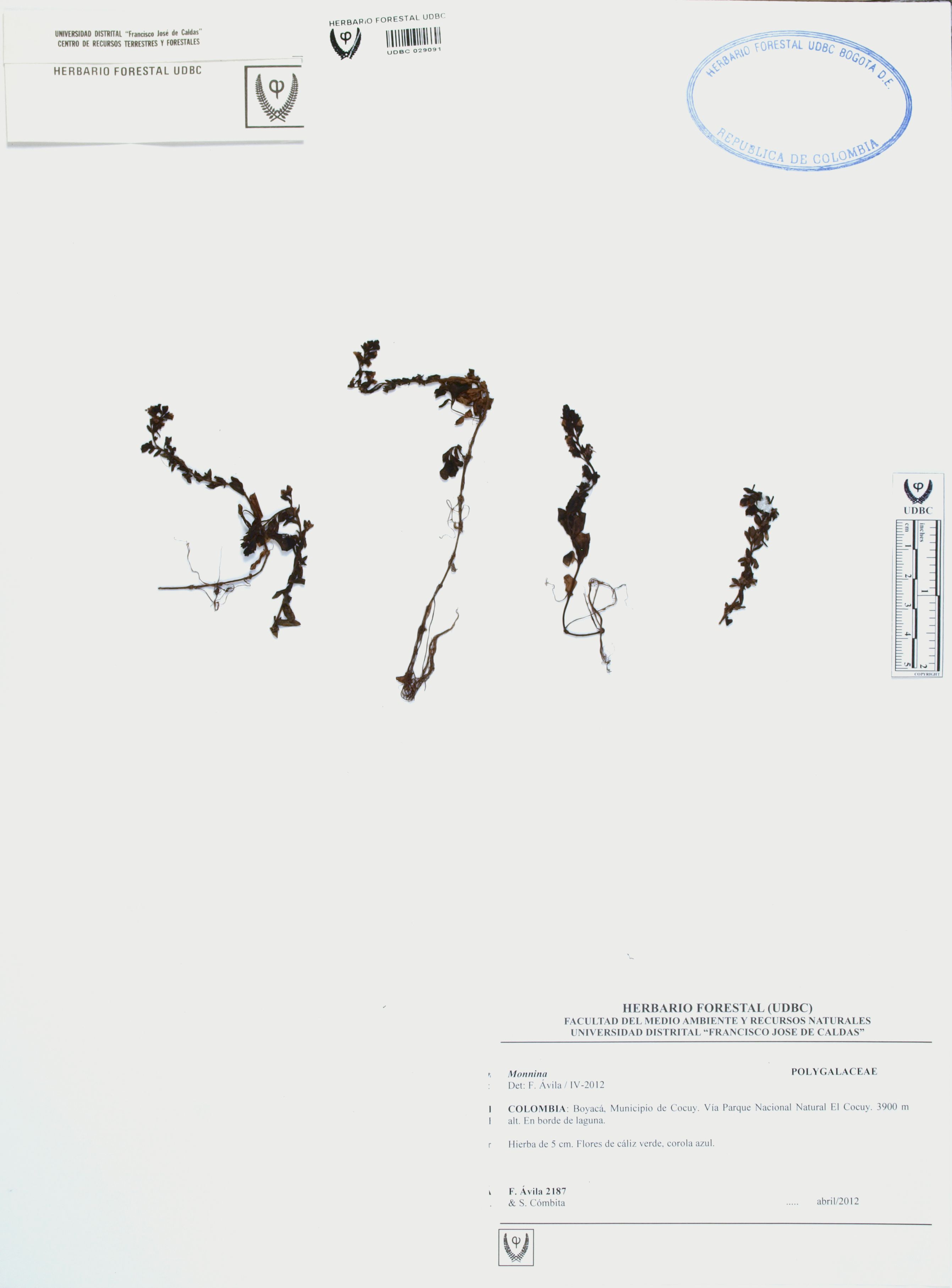 Fotografía del ejemplar Ávila, F. 2187, determinado como Monnina sp. en el año 2012