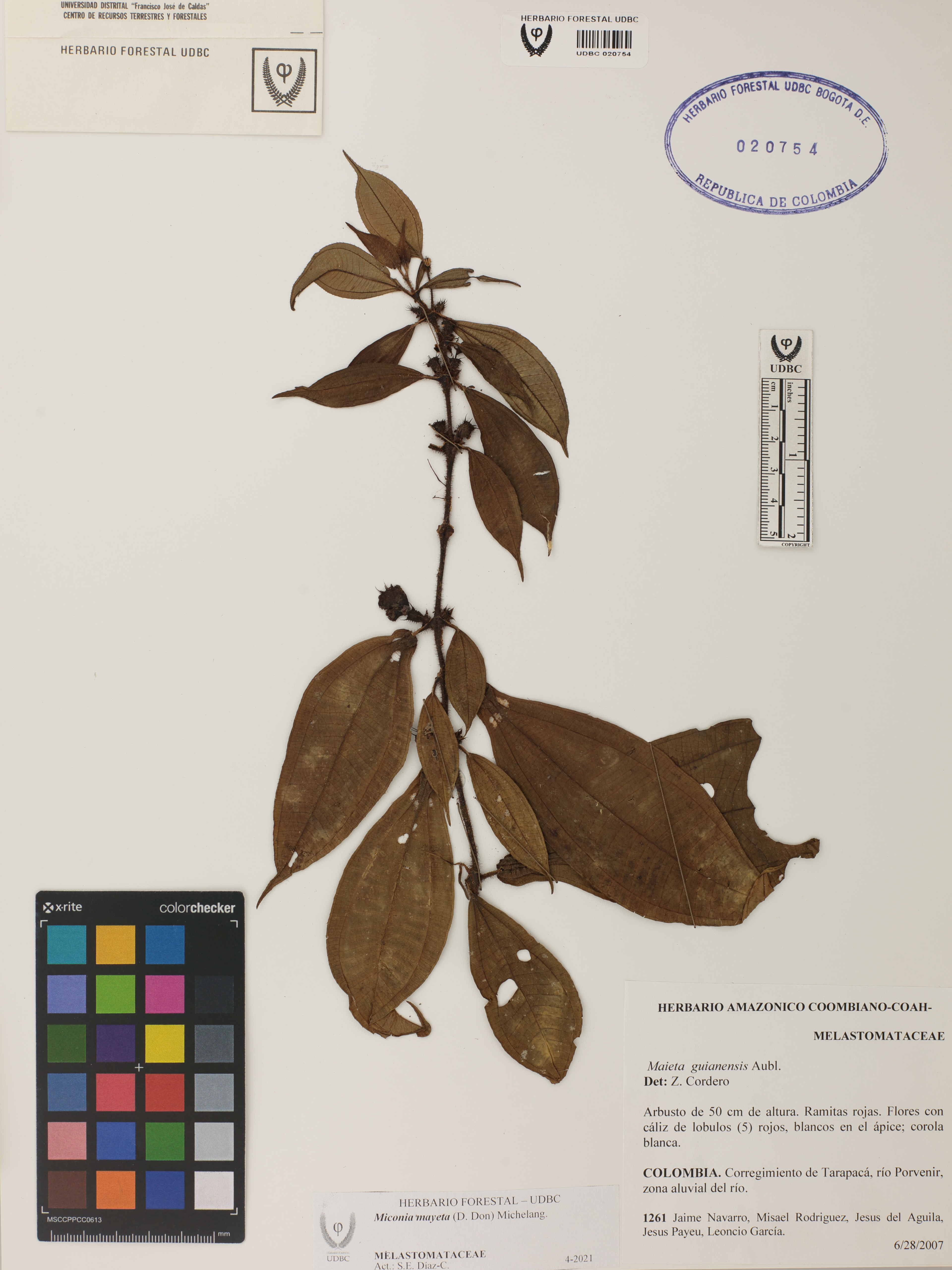 Fotografía del ejemplar Navarro, J. 1261, determinado como Miconia mayeta en el año 2007