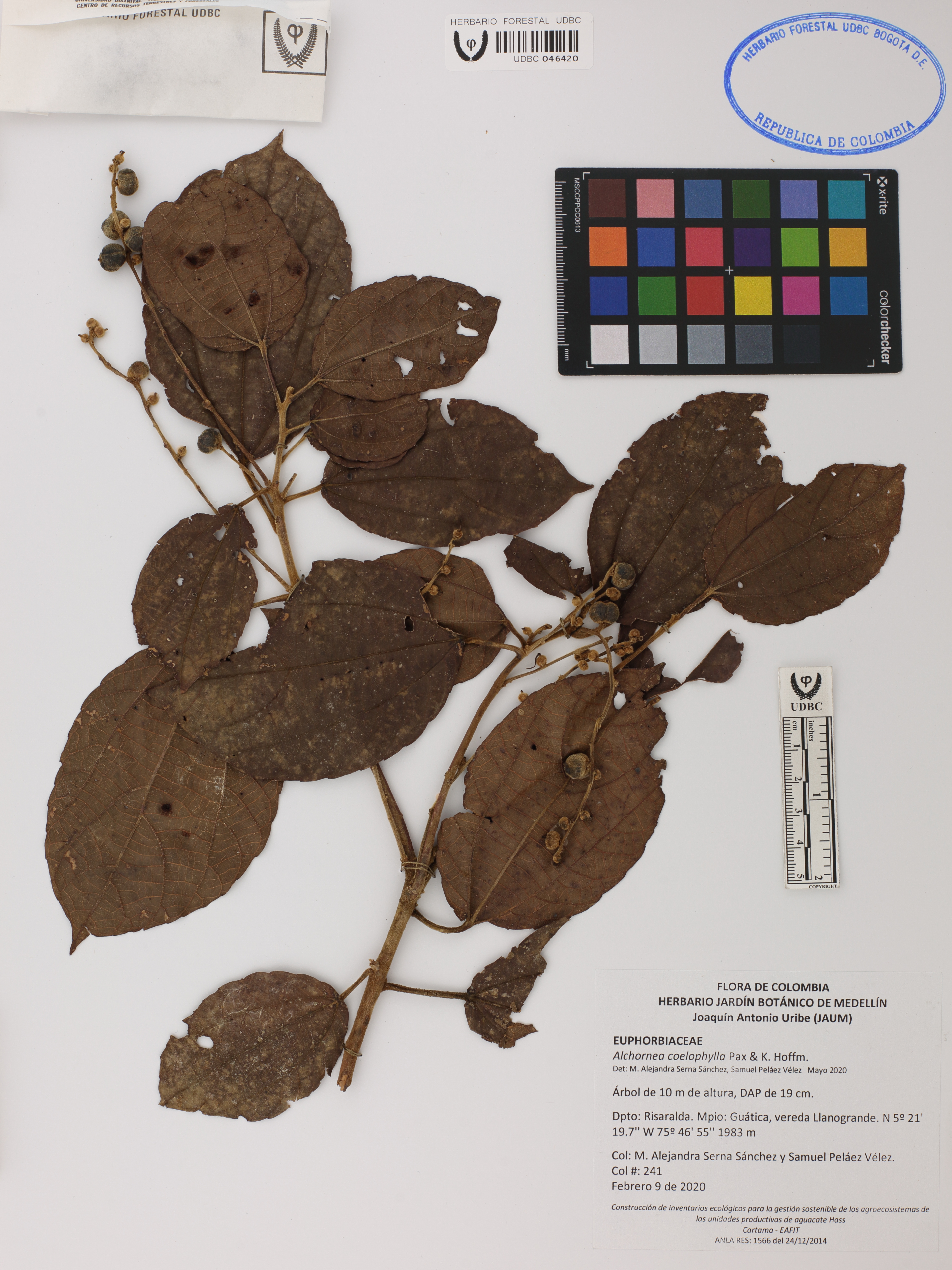 | dc.description | Fotografía del ejemplar Serna-Sánchez, M. 241, determinado como Alchornea coelophylla en el año 2020 | |