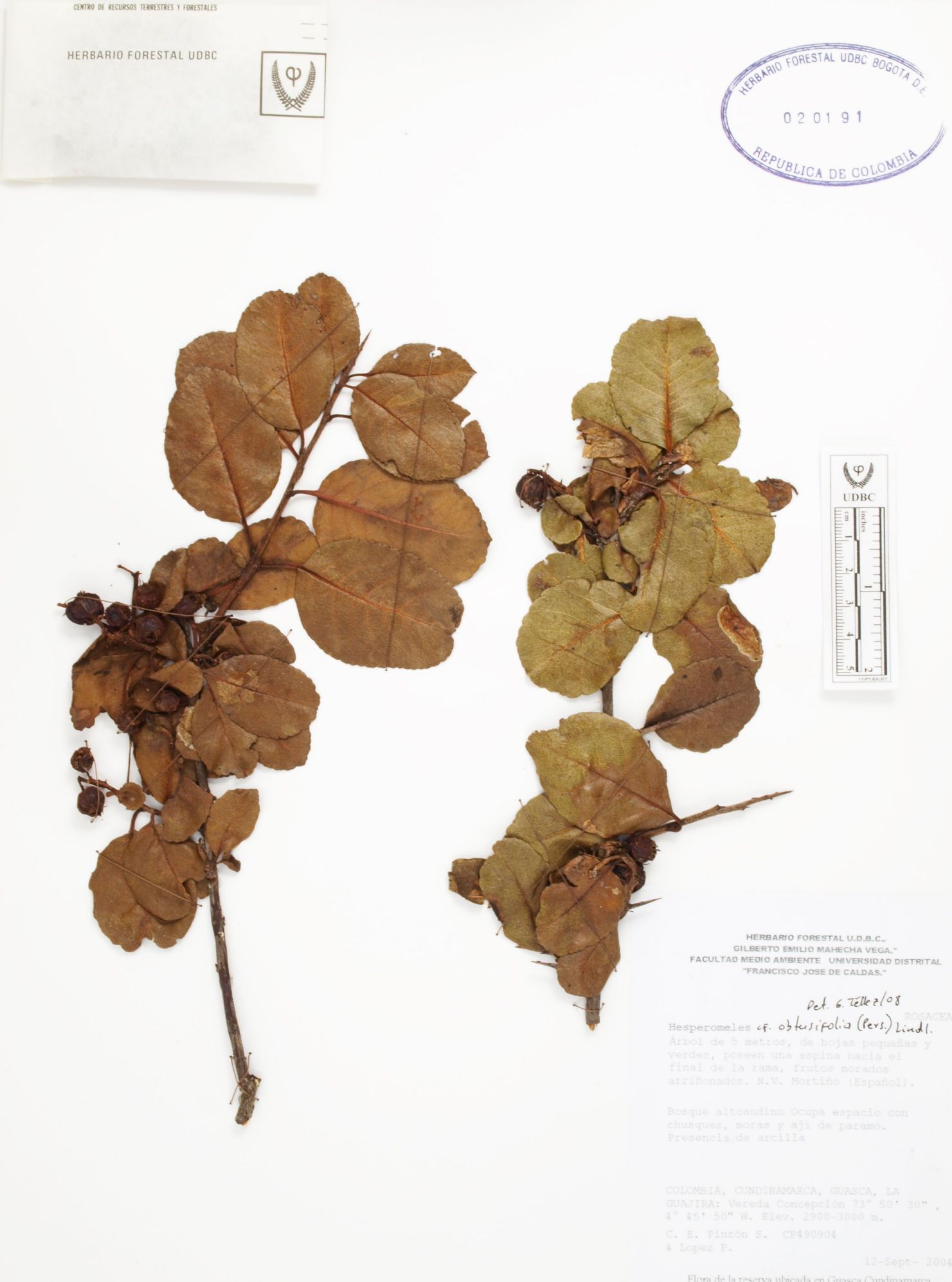 Fotografía del ejemplar Pinzón, C. 49, determinado como Hesperomeles obtusifolia en el año 2008
