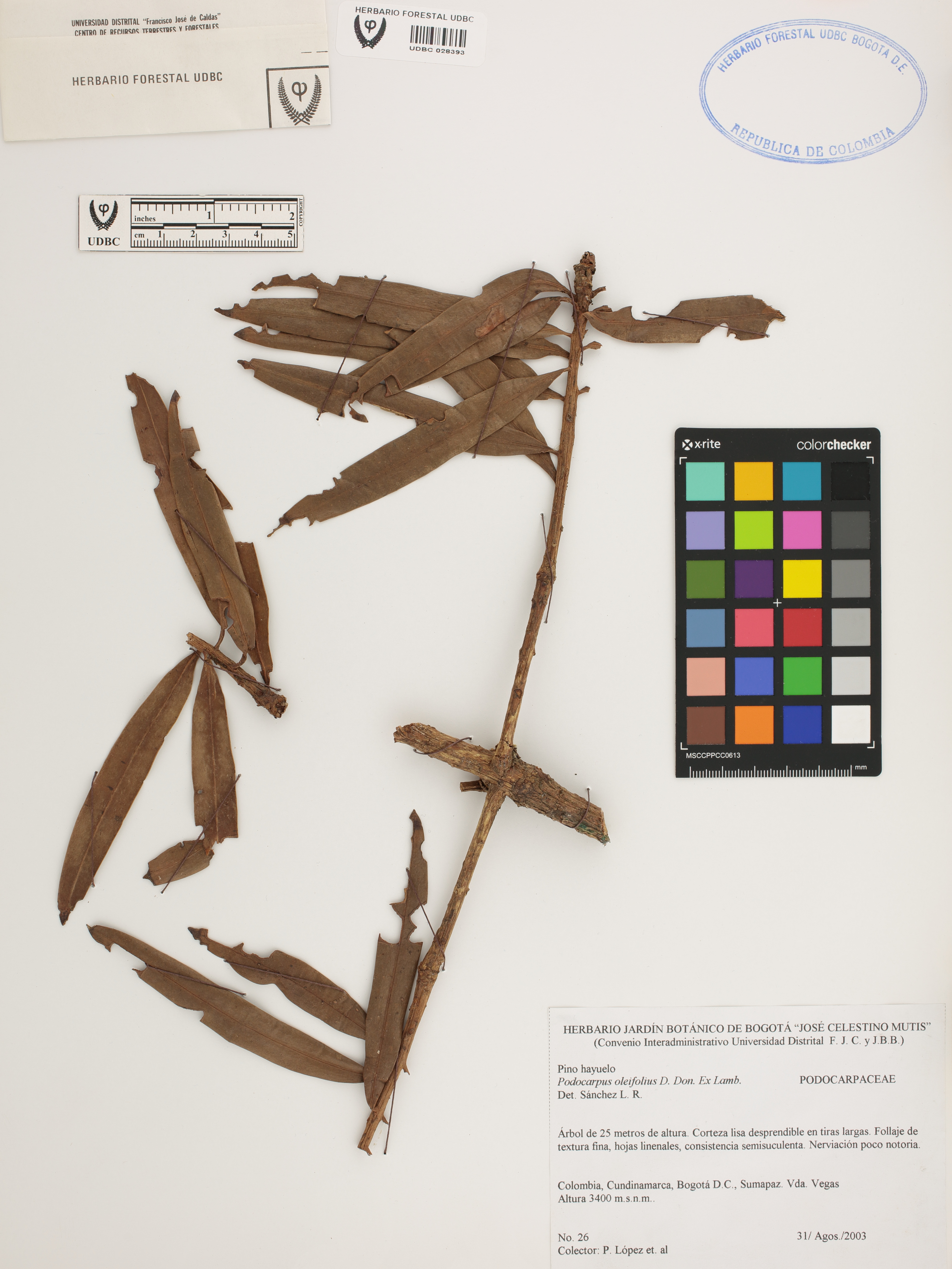 Fotografía del ejemplar López, P. 26, determinado como Podocarpus oleifolius