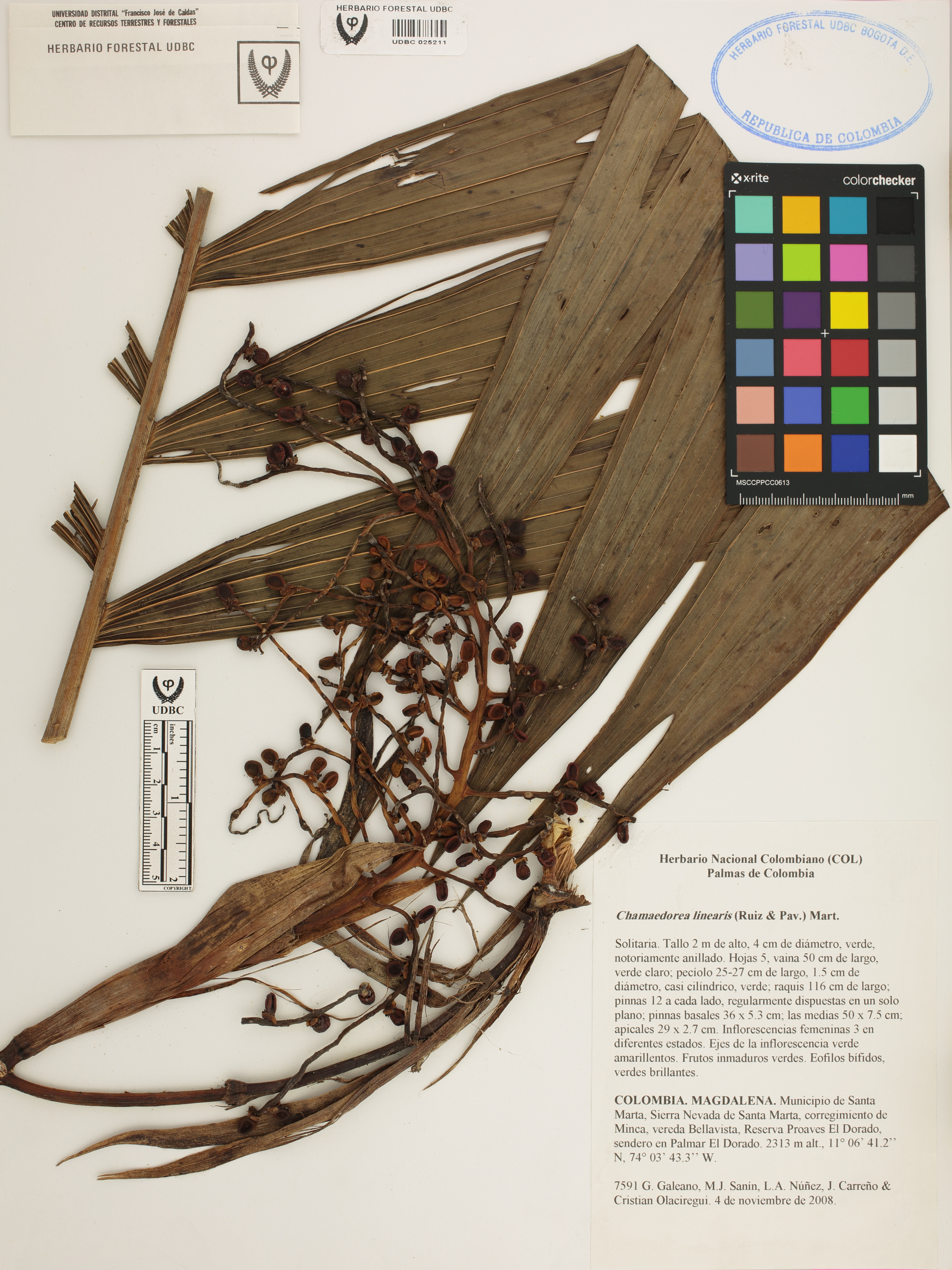 Fotografía del ejemplar Galeano, G. 7591, determinado como Chamaedorea linearis