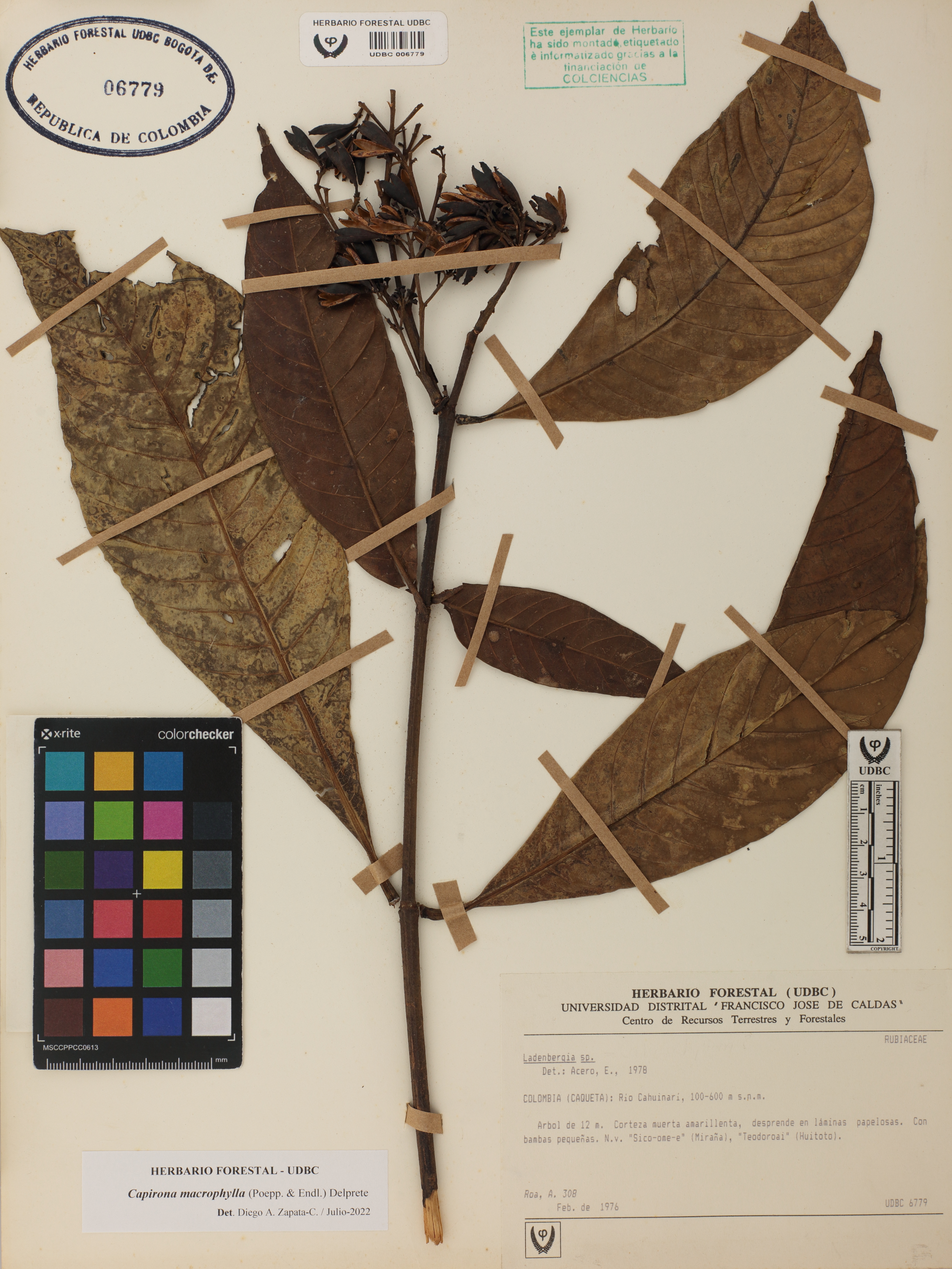 Fotografía del ejemplar Roa, A. 308, determinado como Capirona macrophylla en el año 2022