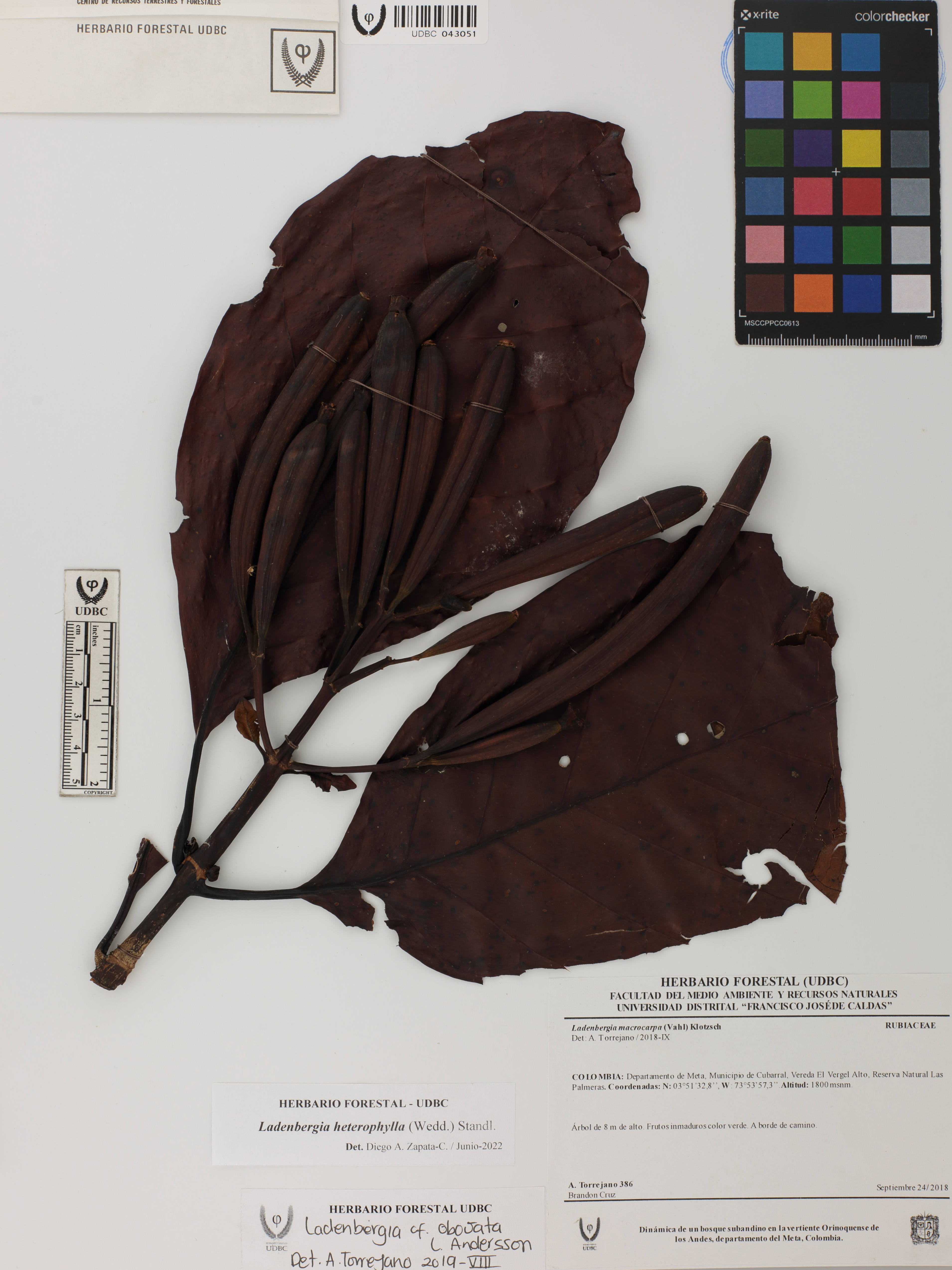 Fotografía del ejemplar Torrejano, A. 386, determinado como Ladenbergia heterophylla en el año 2022