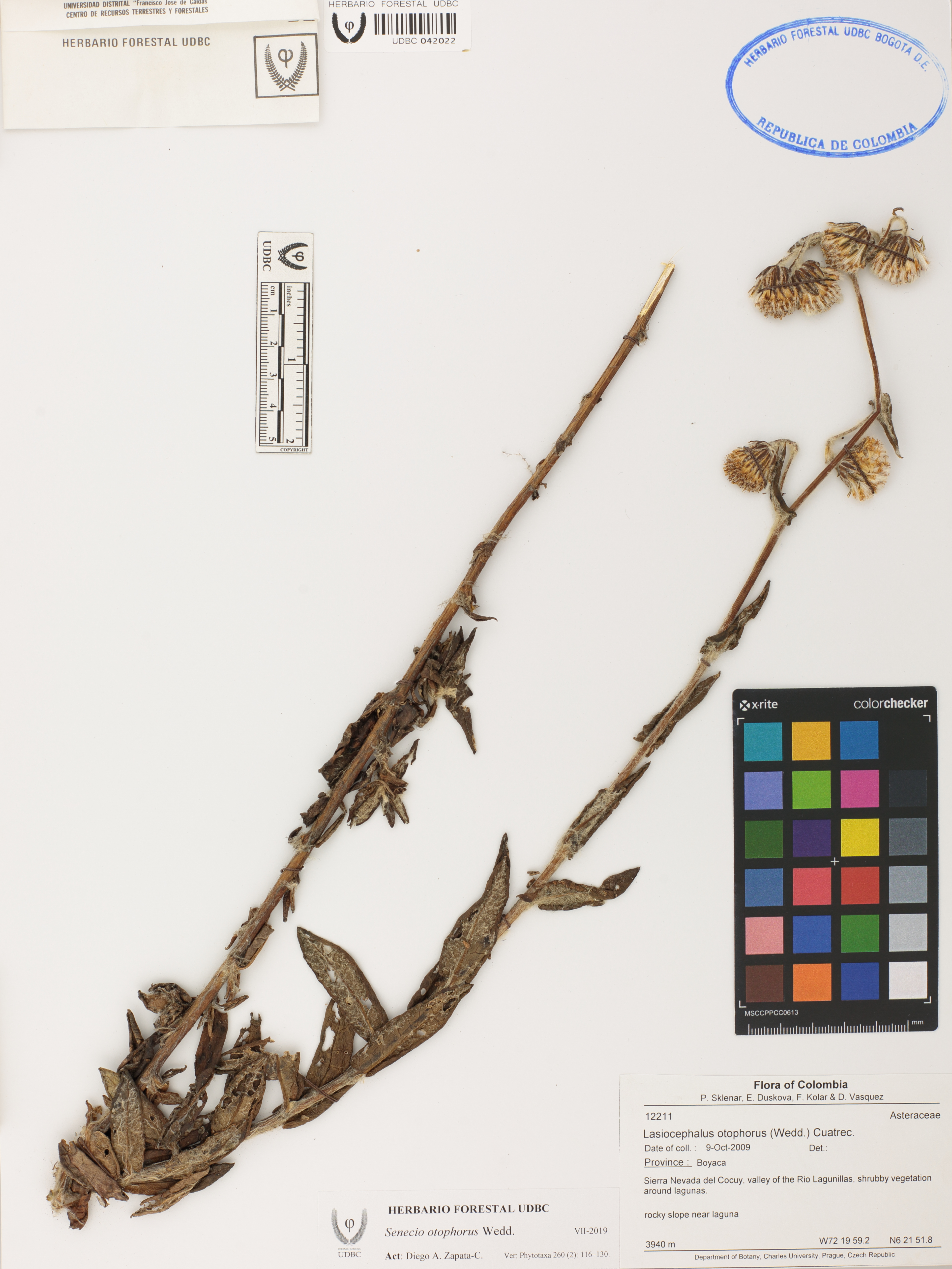 Fotografía del ejemplar Sklenar, P. 12211, determinado como Senecio otophorus en el año 2009