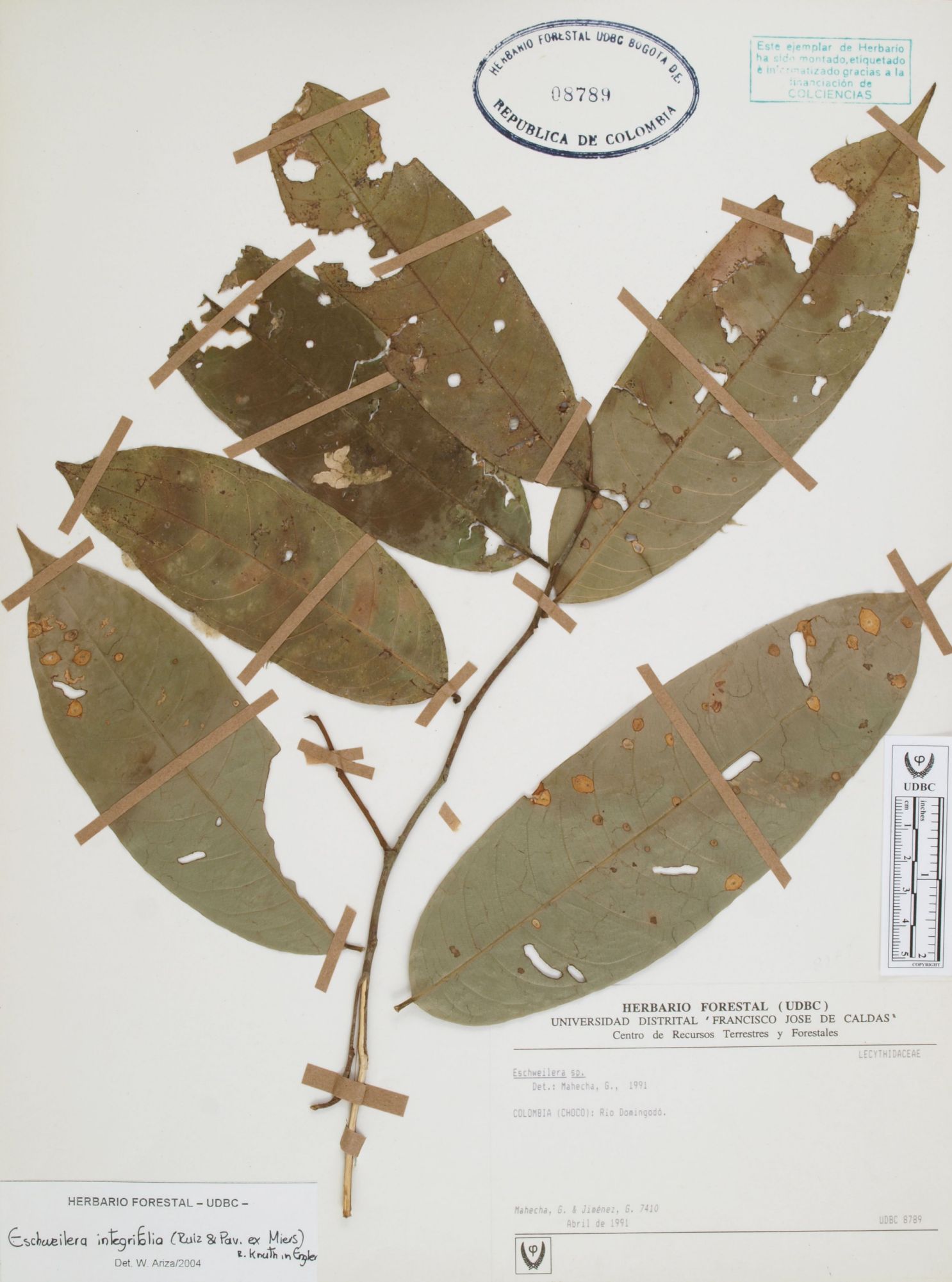 Fotografía del ejemplar Mahecha, G. 7410, determinado como Eschweilera integrifolia en el año 2009