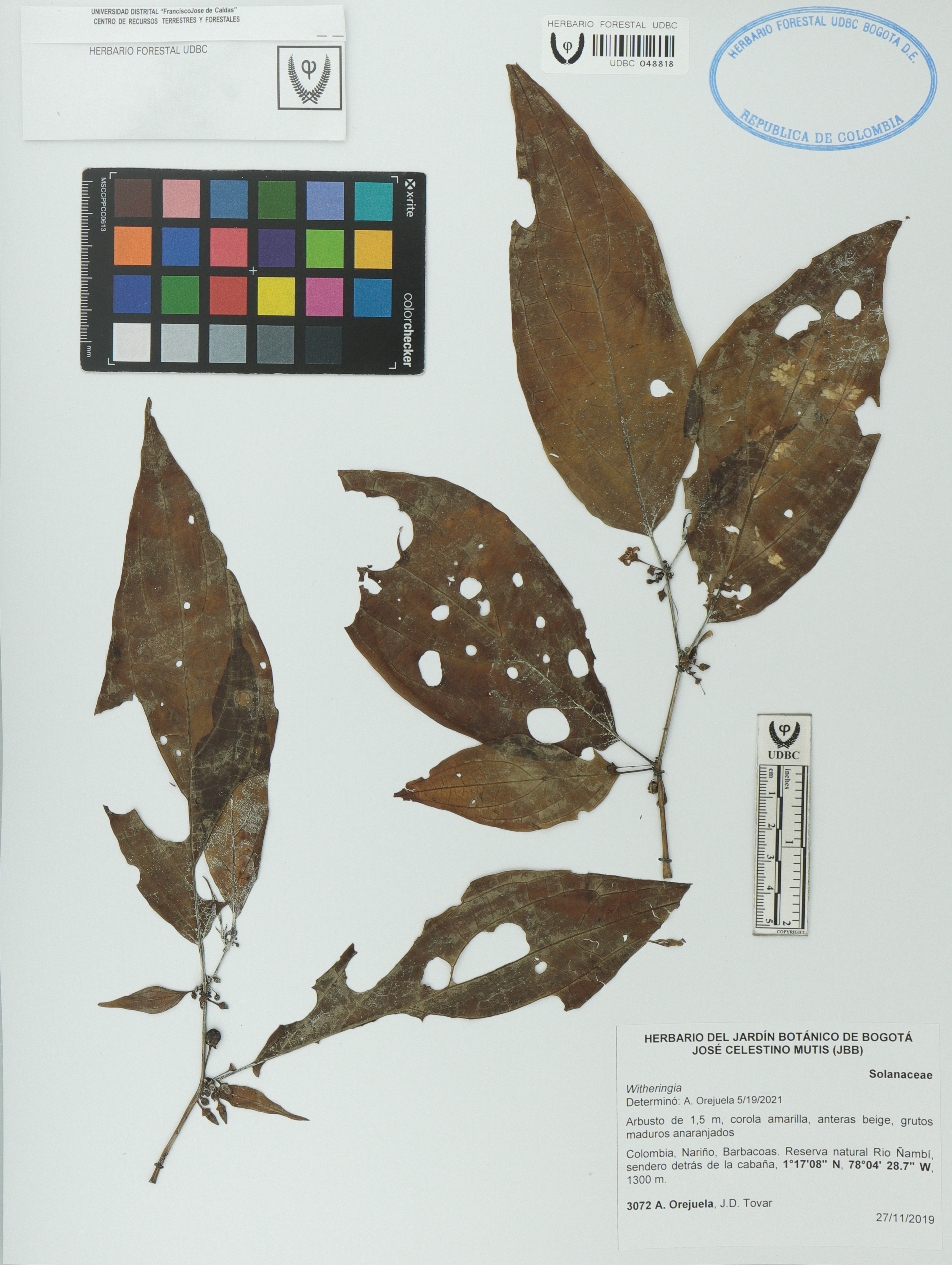 Fotografía del ejemplar Orejuela, A. 3072, determinado como Witheringia sp. en el año 2022