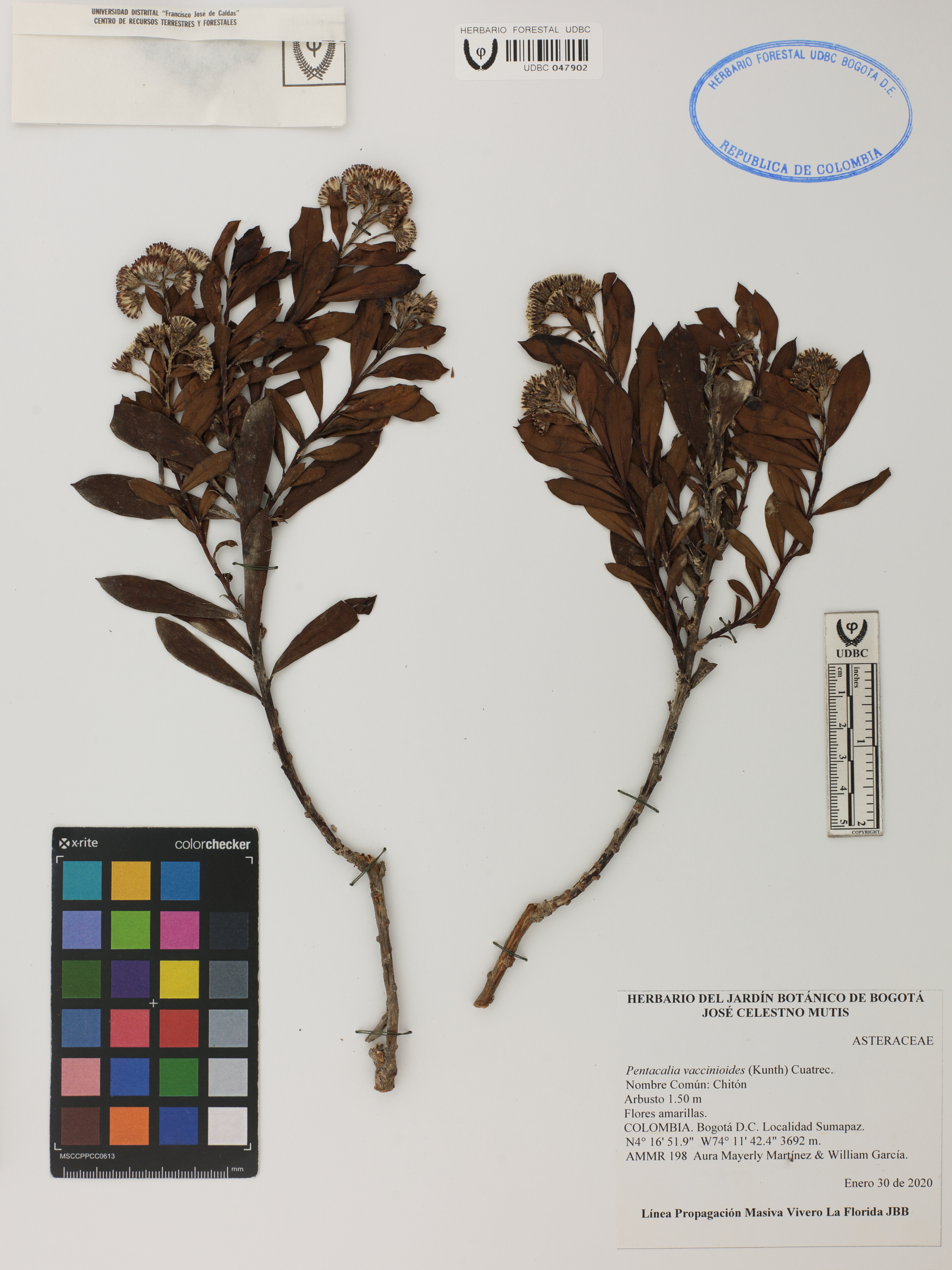 | dc.description | Fotografía del ejemplar Martínez, A. 198, determinado como Pentacalia vaccinioides en el año 2020 | |