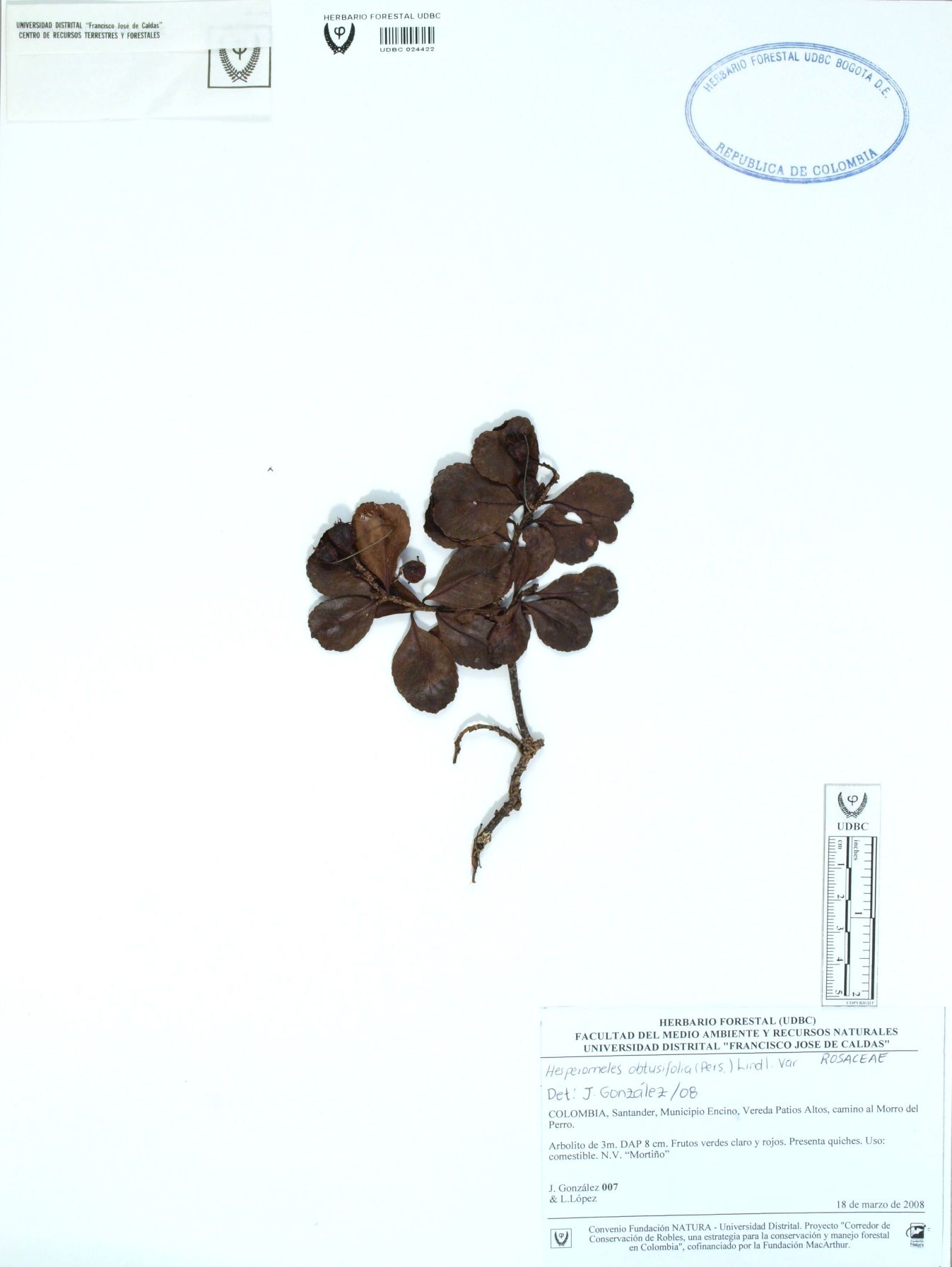 Fotografía del ejemplar González, J. 7, determinado como Hesperomeles obtusifolia en el año 2008