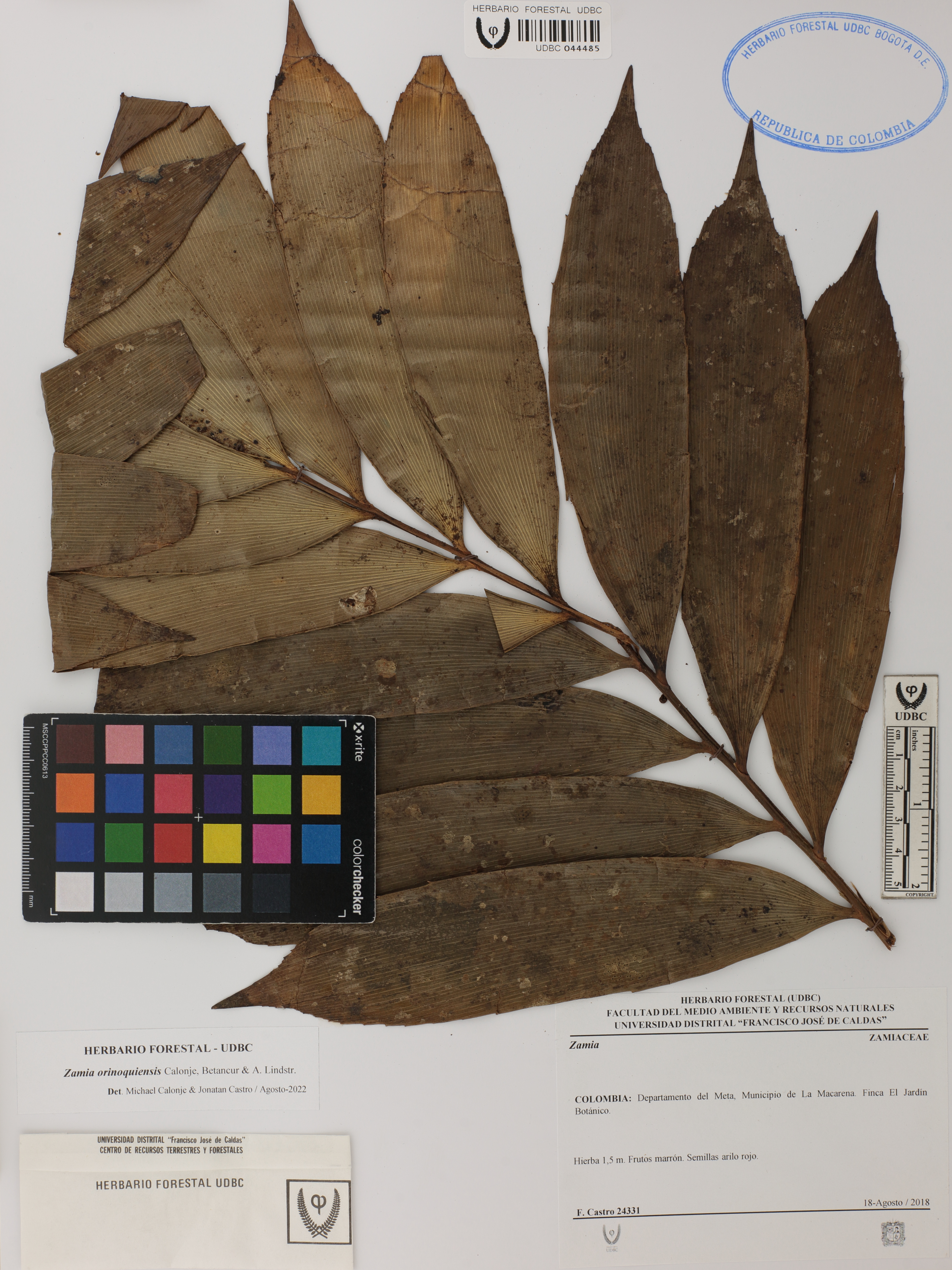 Fotografía del ejemplar Castro, F. 24331, determinado como Zamia orinoquiensis en el año 2022