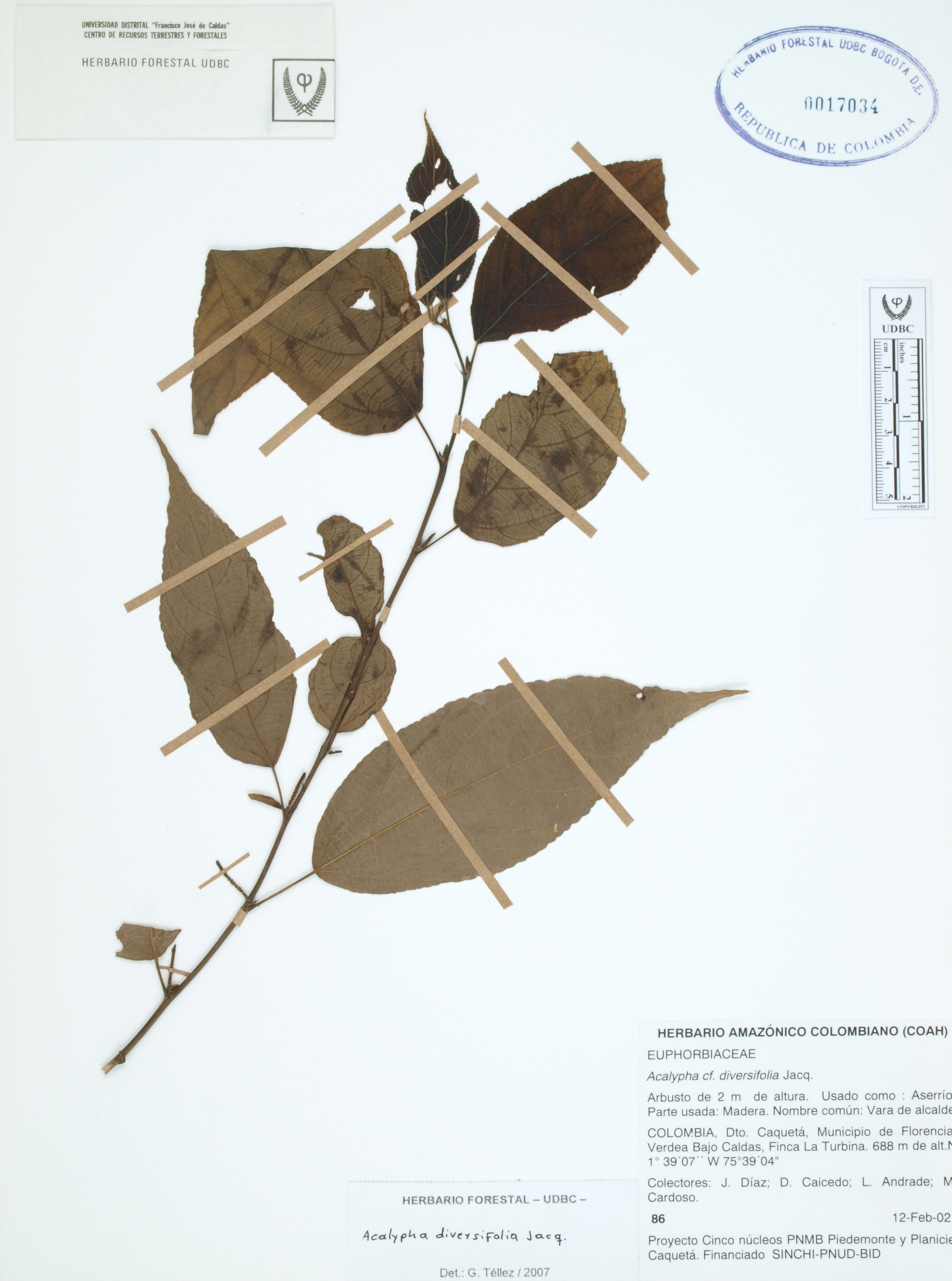 Fotografía del ejemplar Díaz, J. 86, determinado como Acalypha diversifolia en el año 2007