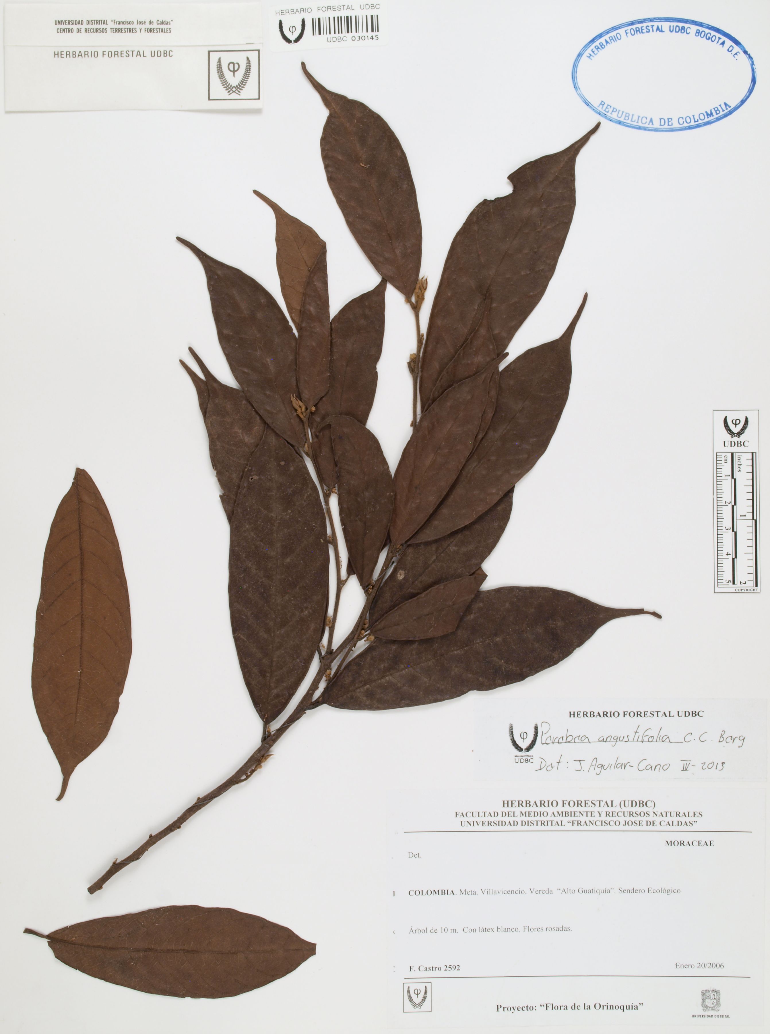 Fotografía del ejemplar Castro, F. 2592, determinado como Perebea angustifolia en el año 2013