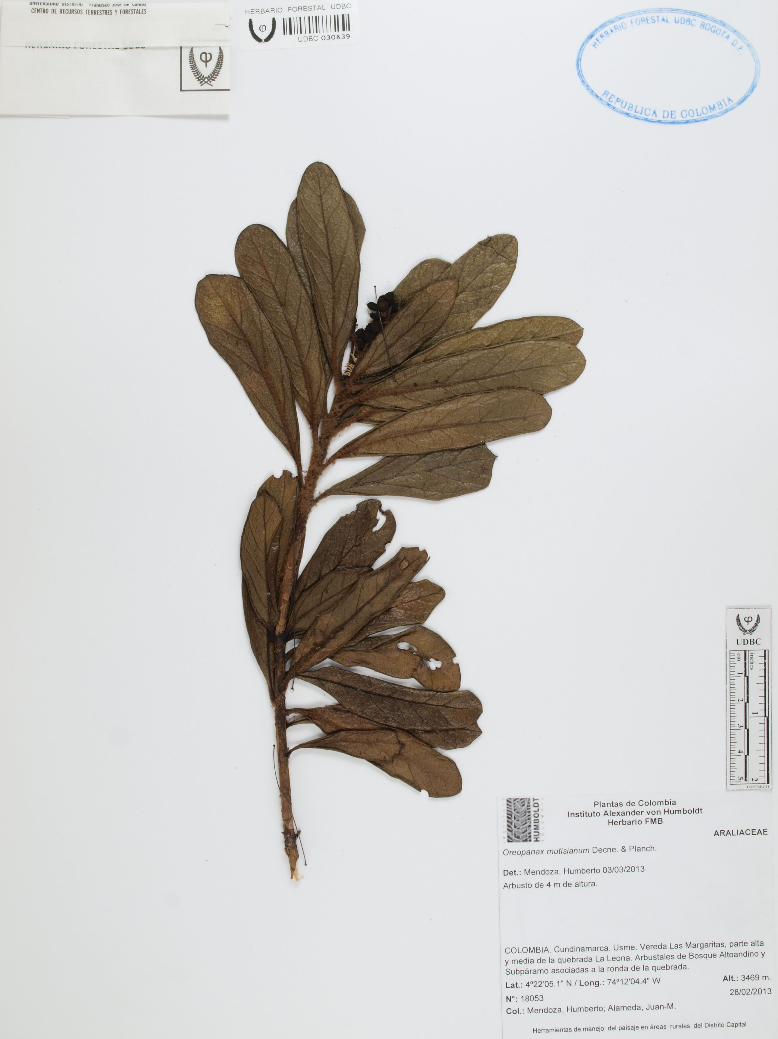 Fotografía del ejemplar Mendoza, H. 18053, determinado como Oreopanax mutisianus en el año 2013