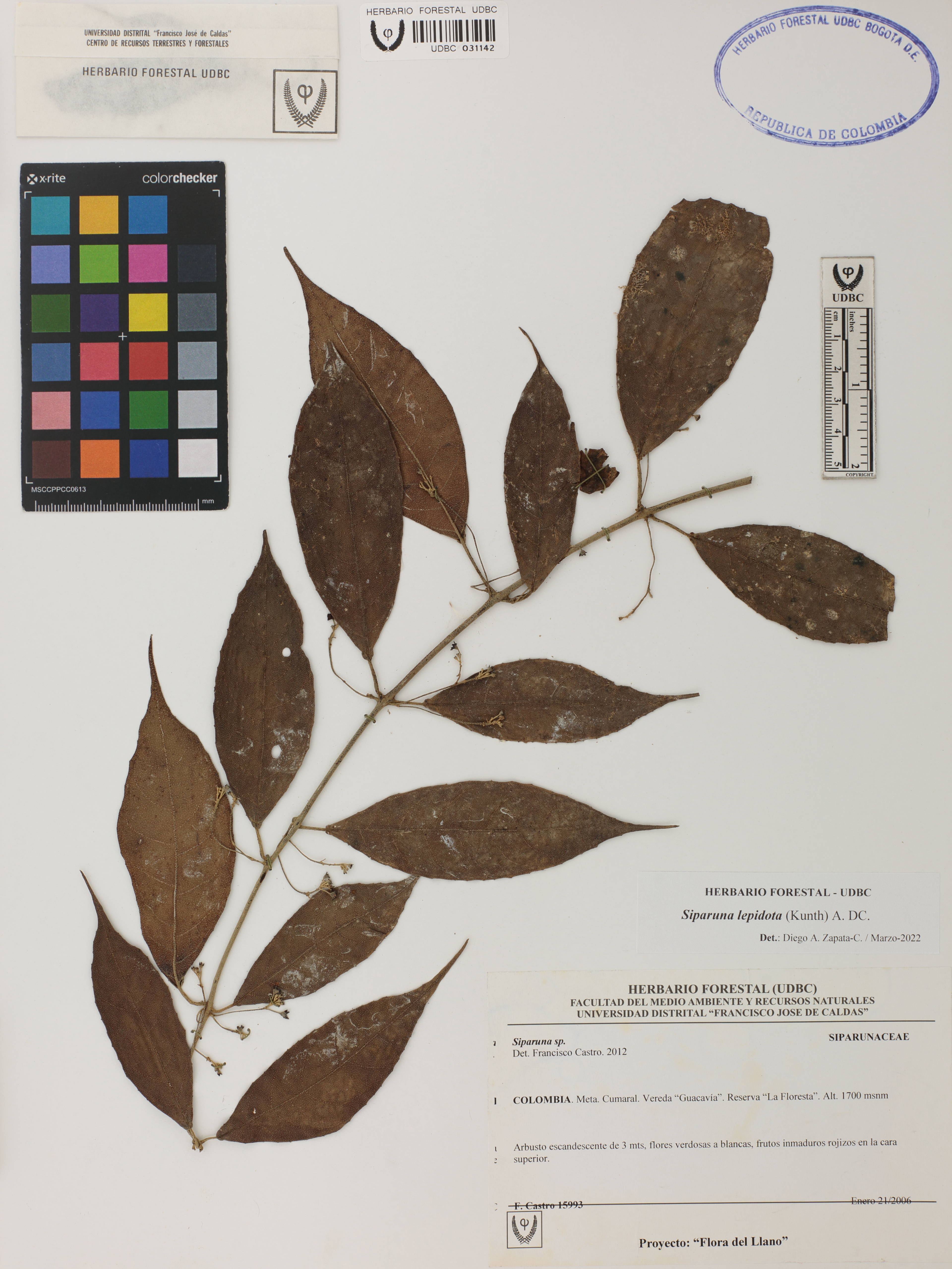 Fotografía del ejemplar Castro, F. 15993, determinado como Siparuna lepidota en el año 2022