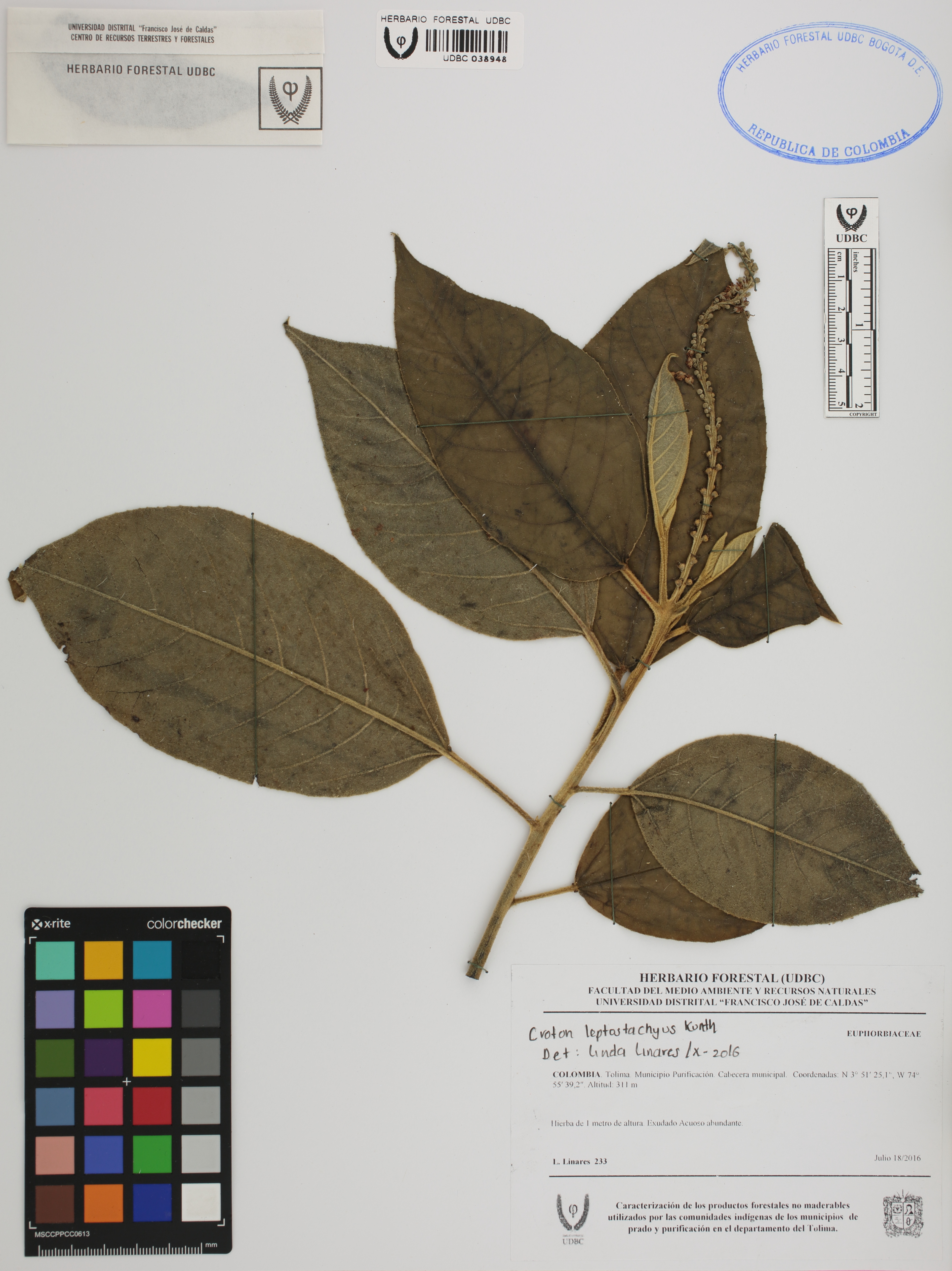 Fotografía del ejemplar Linares, L. 233, determinado como Croton leptostachyus en el año 2016