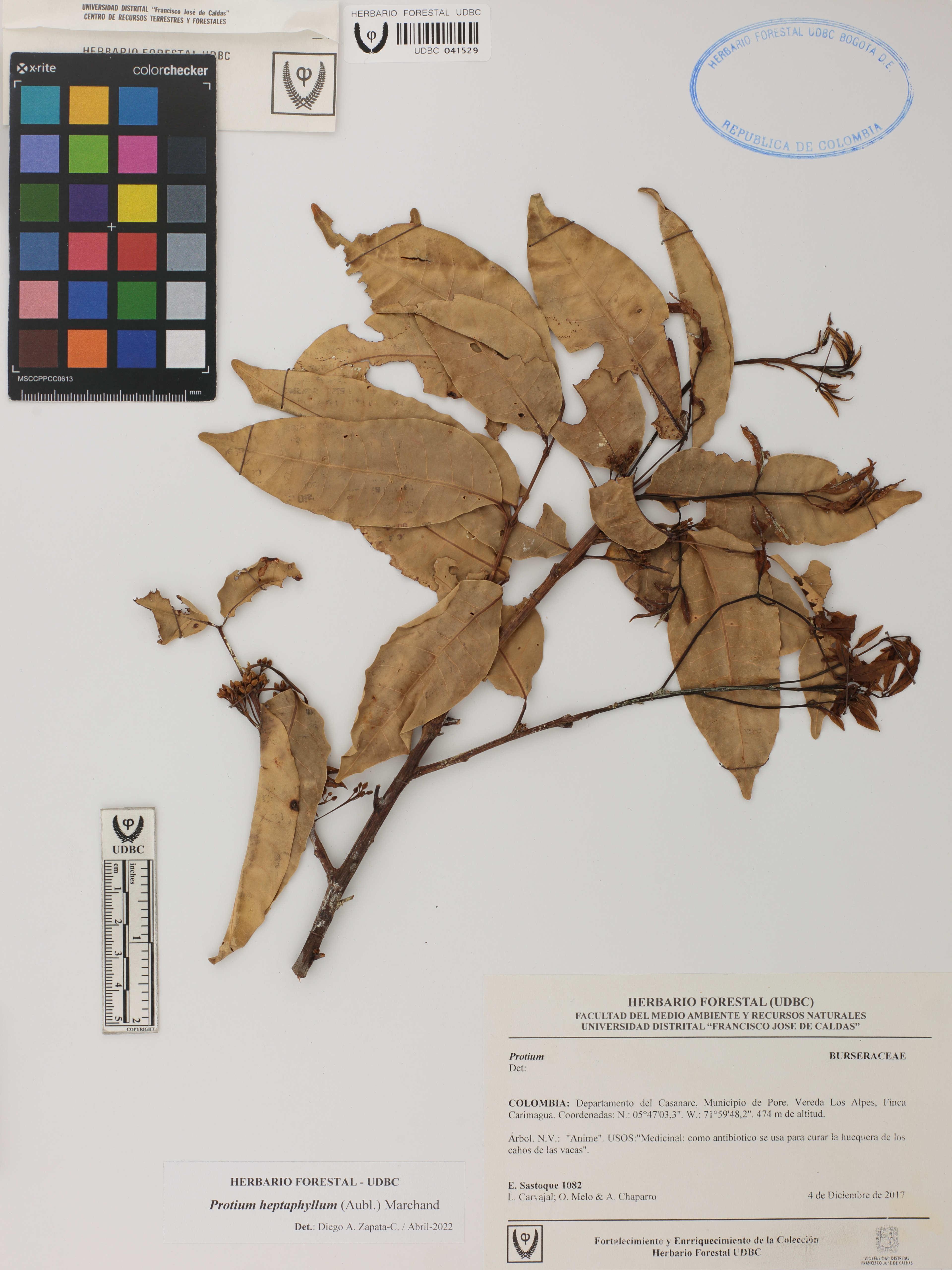 Fotografía del ejemplar Sastoque, E. 1082, determinado como Protium heptaphyllum en el año 2022