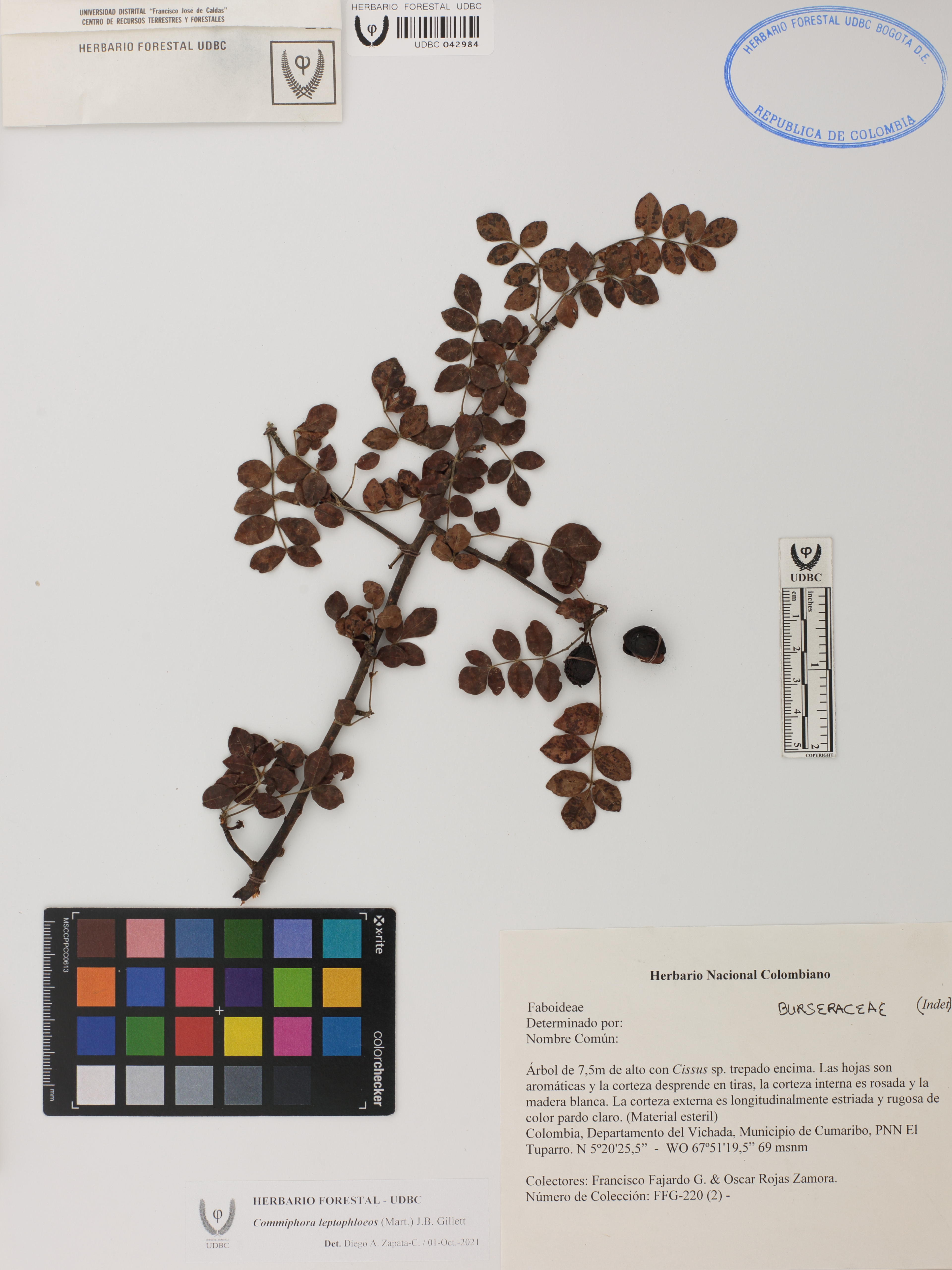 Fotografía del ejemplar Fajardo, F. 220, determinado como Commiphora leptophloeos en el año 2021
