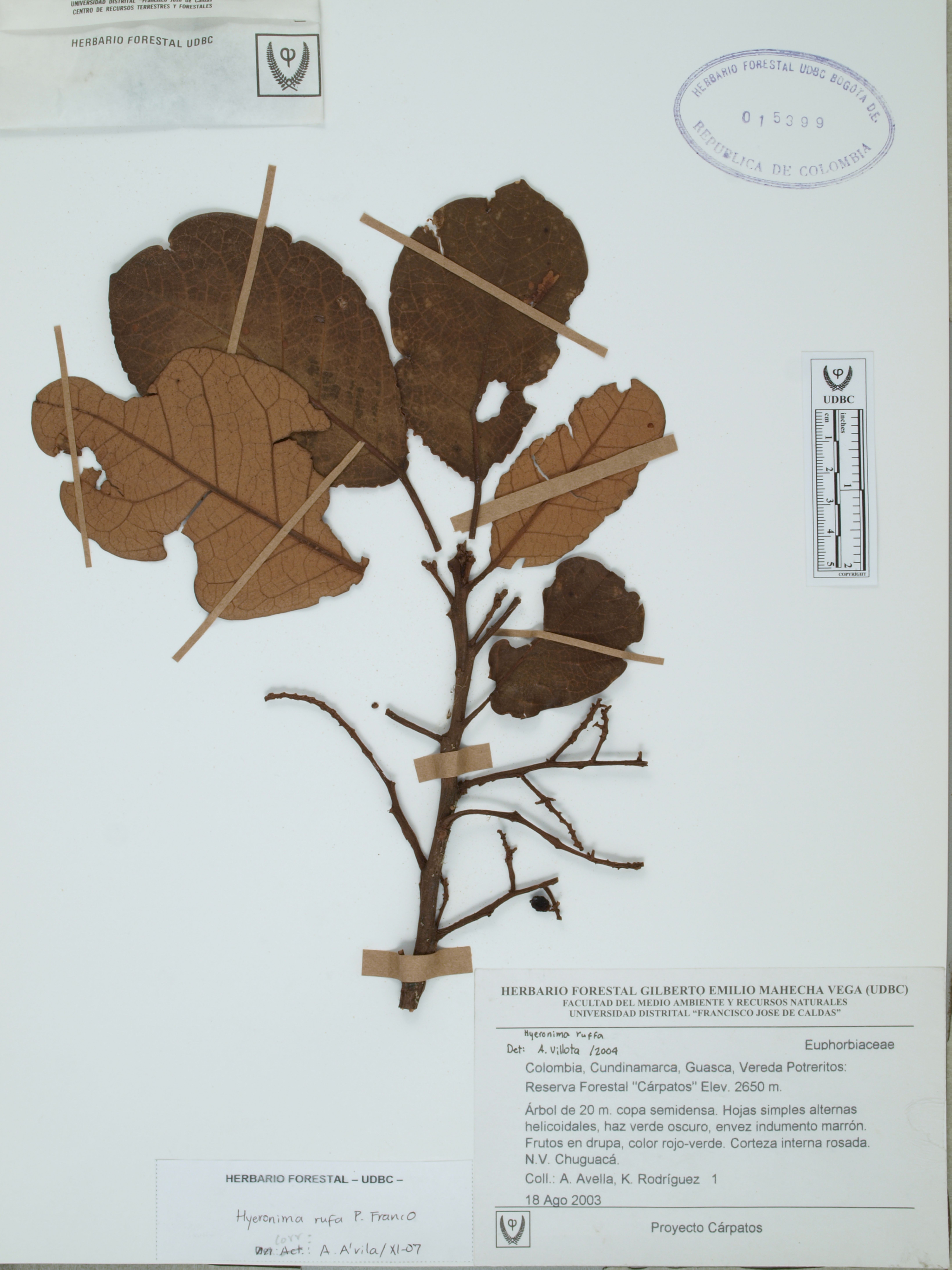 Fotografía del ejemplar Avella, A. 1, determinado como Hieronyma rufa en el año 2007