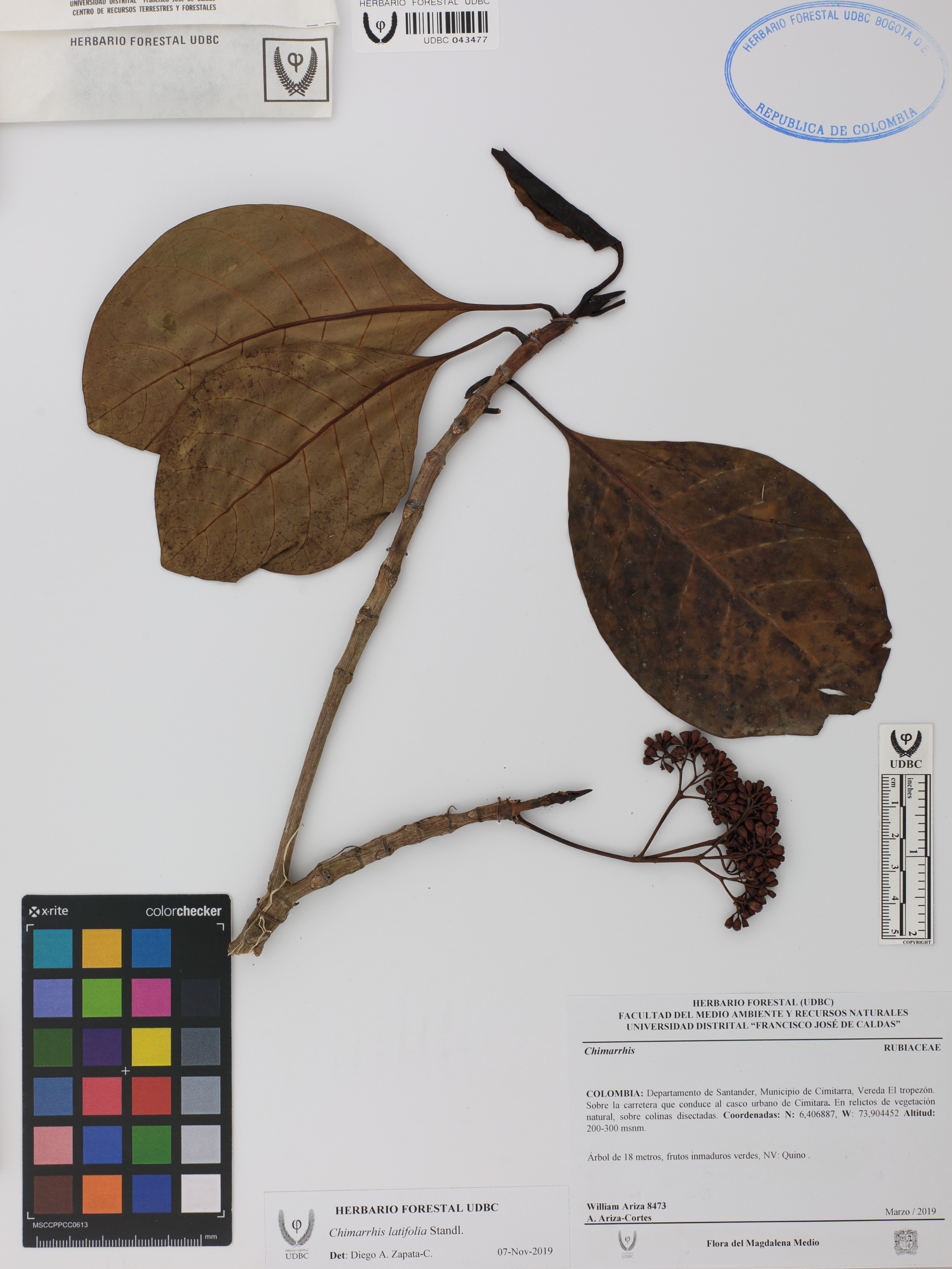 Fotografía del ejemplar Ariza, W. 8473, determinado como Chimarrhis latifolia en el año 2019