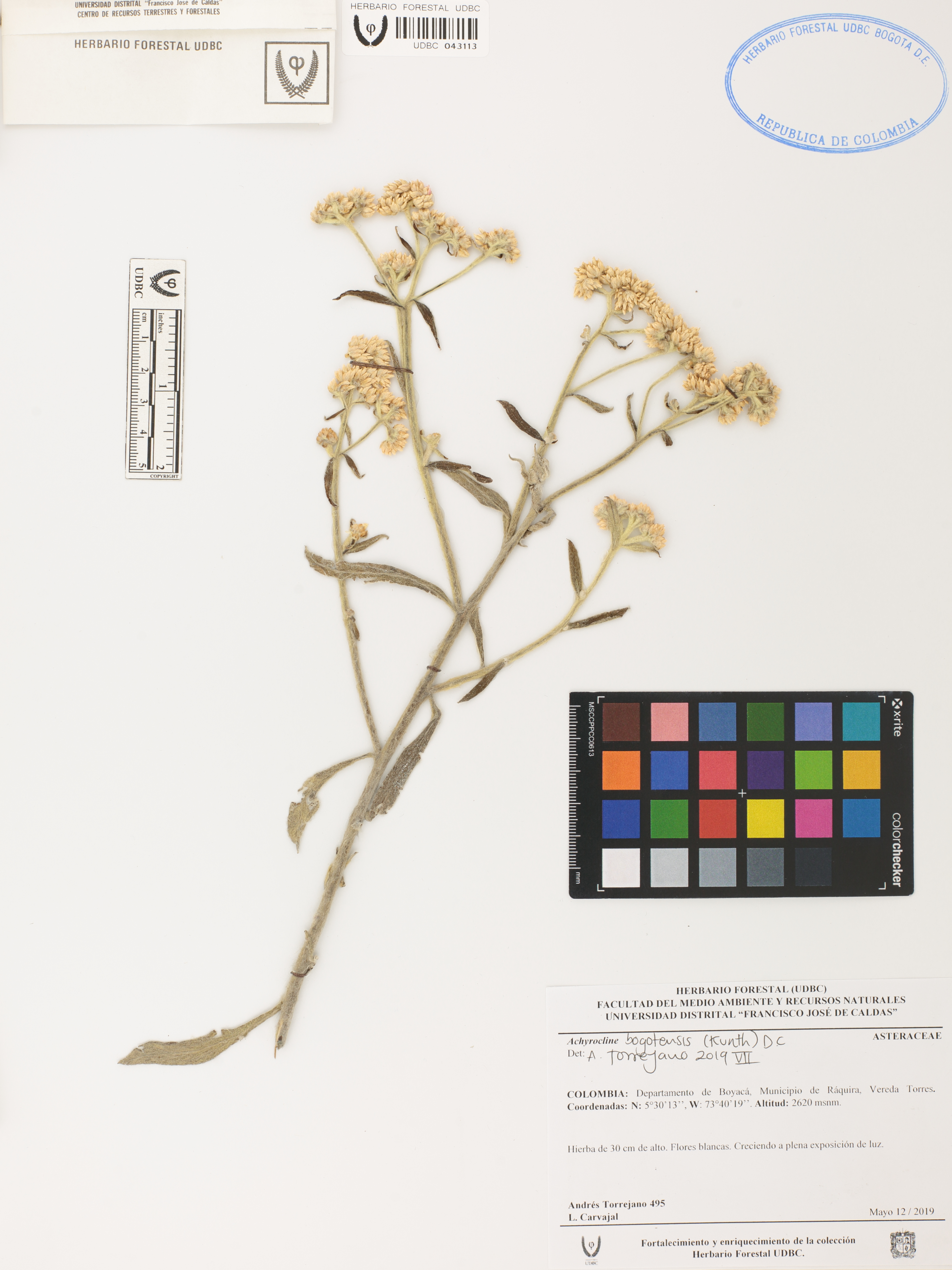 Fotografía del ejemplar Torrejano, A. 495, determinado como Achyrocline bogotensis en el año 2019