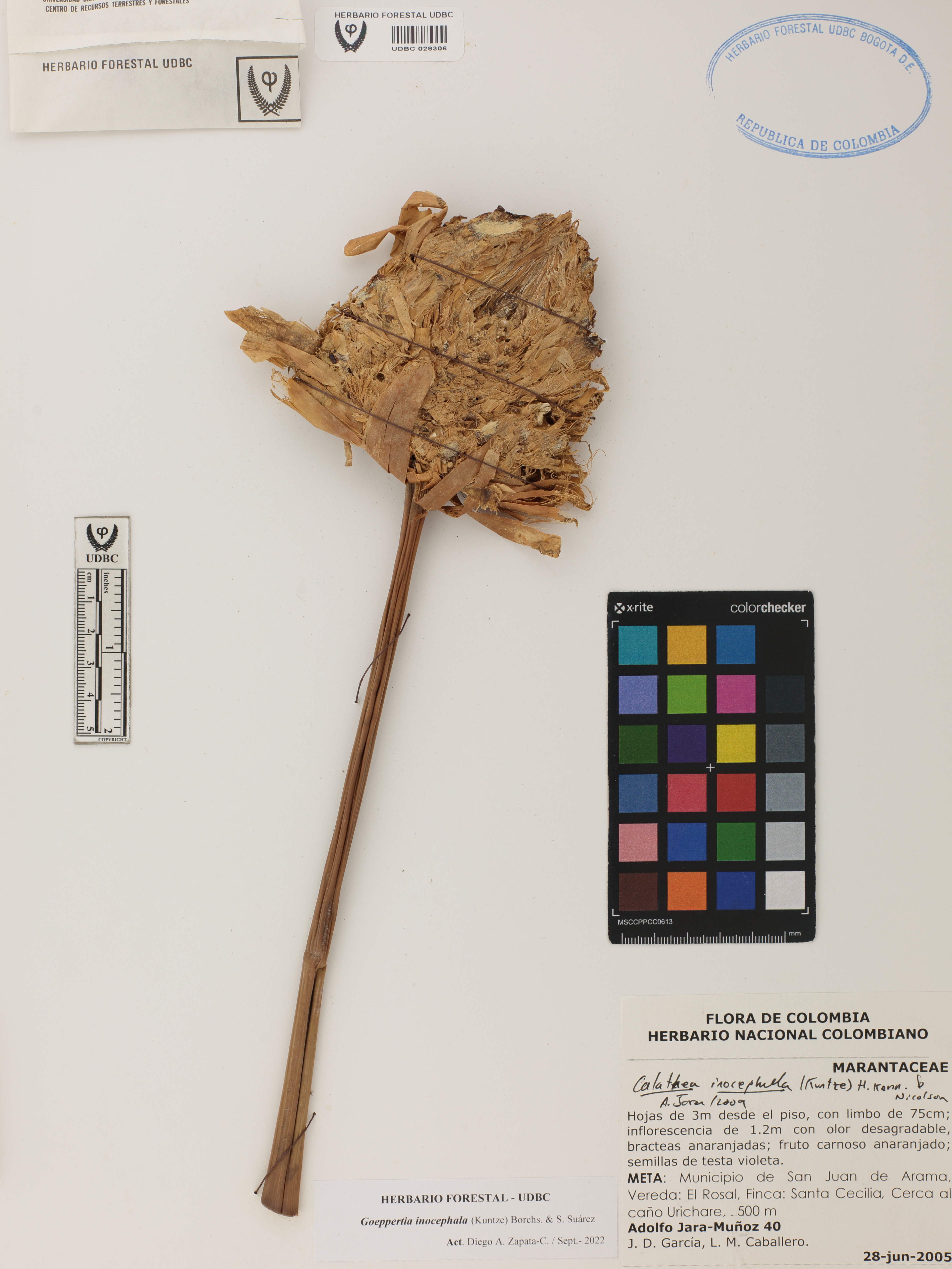 Fotografía del ejemplar Jara-Muñoz, A. 40, determinado como Goeppertia inocephala en el año 2009