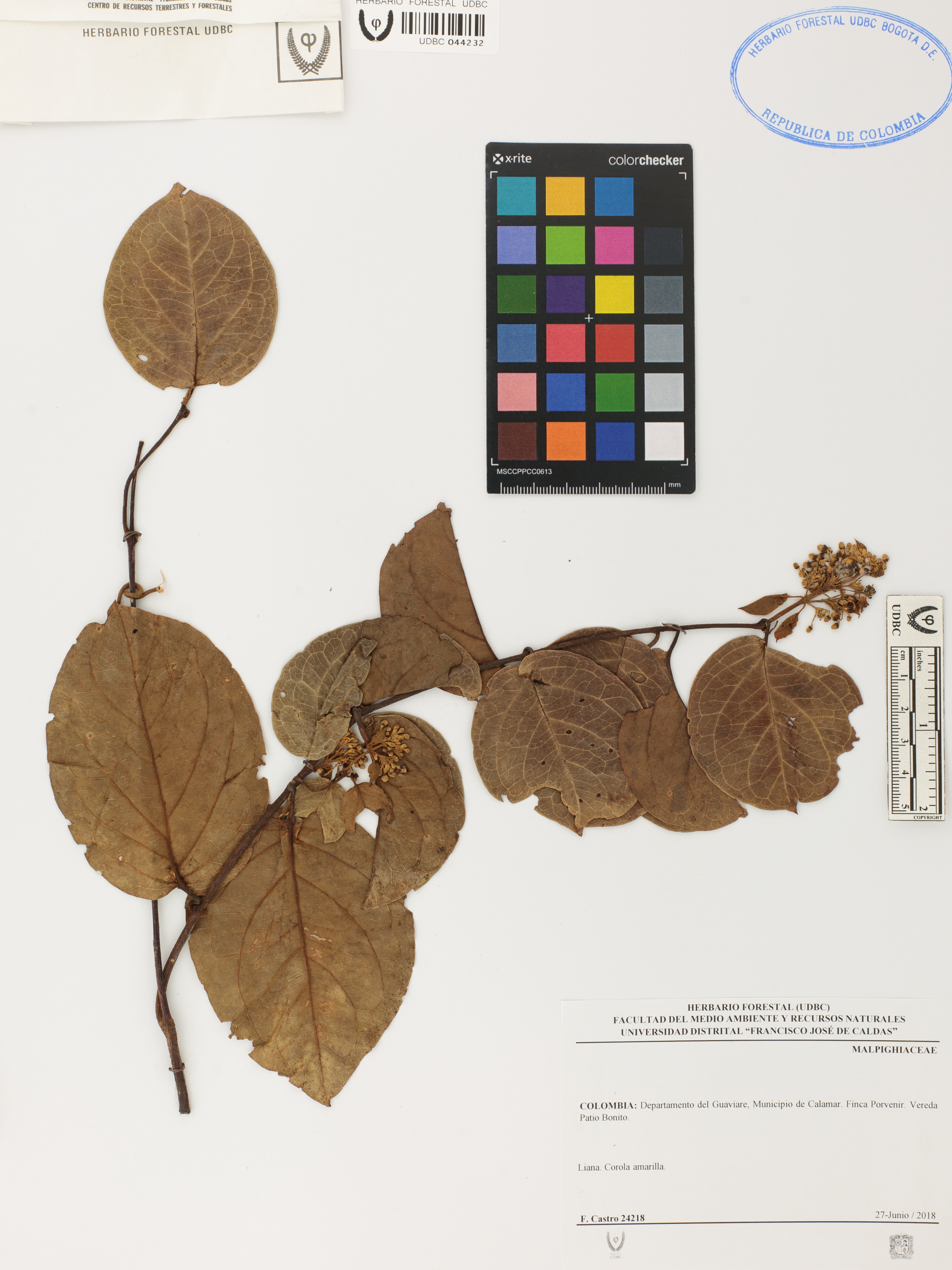Fotografía del ejemplar Castro, F. 24218, determinado como Malpighiaceae