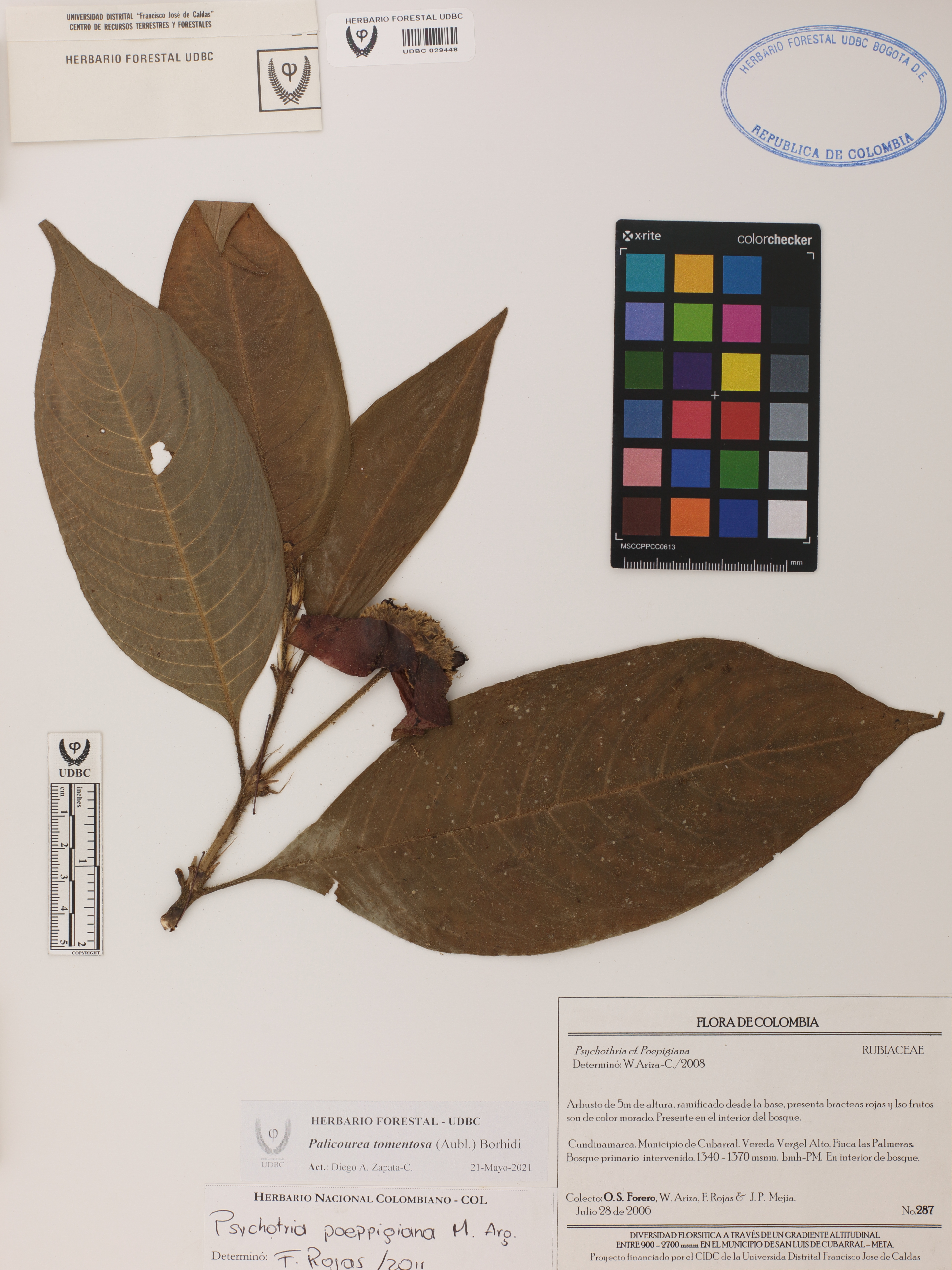 Fotografía del ejemplar Forero, O. 287, determinado como Palicourea tomentosa en el año 2011