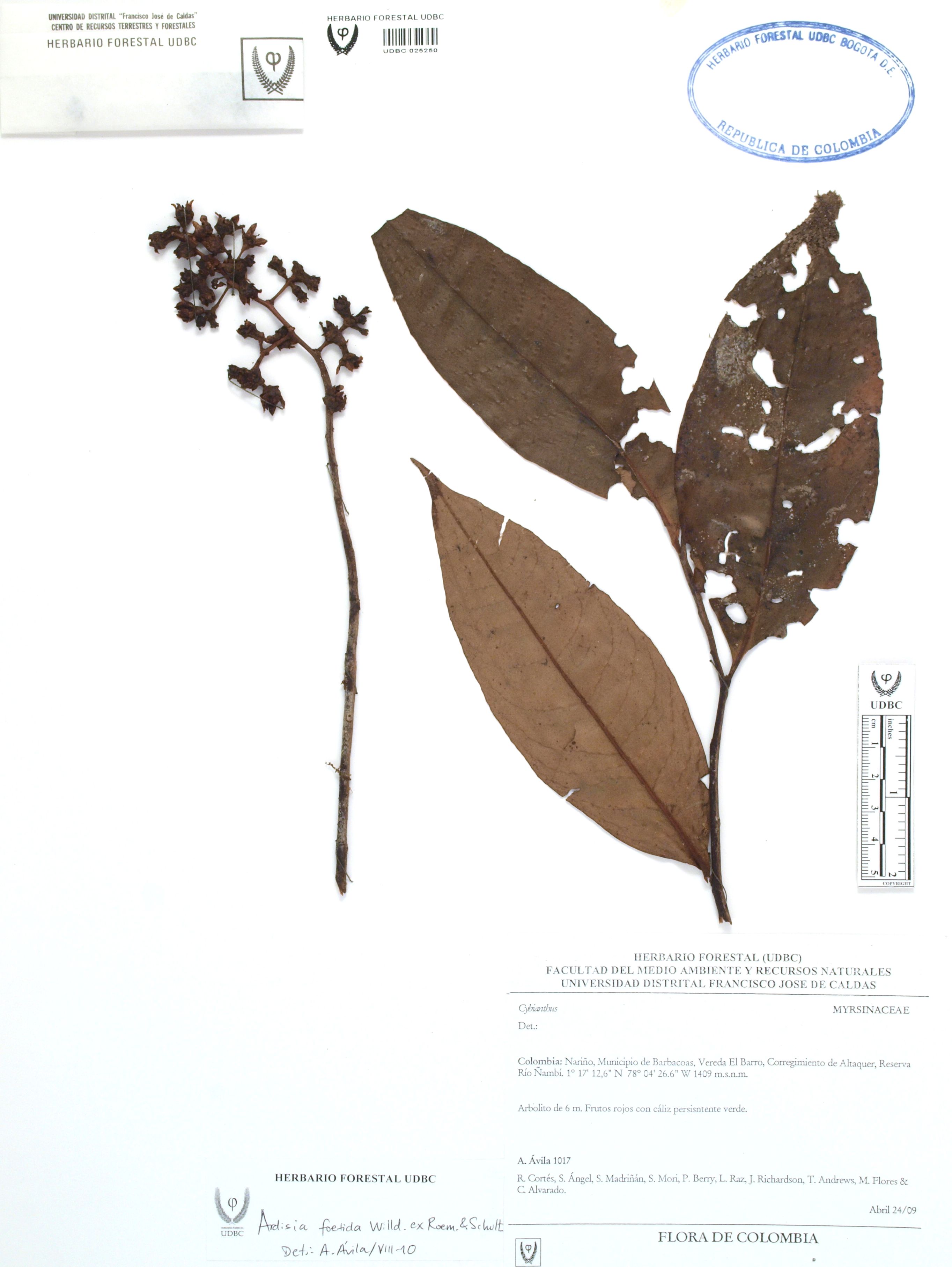 Fotografía del ejemplar Ávila, F. 1017, determinado como Cybianthus occigranatensis en el año 2022