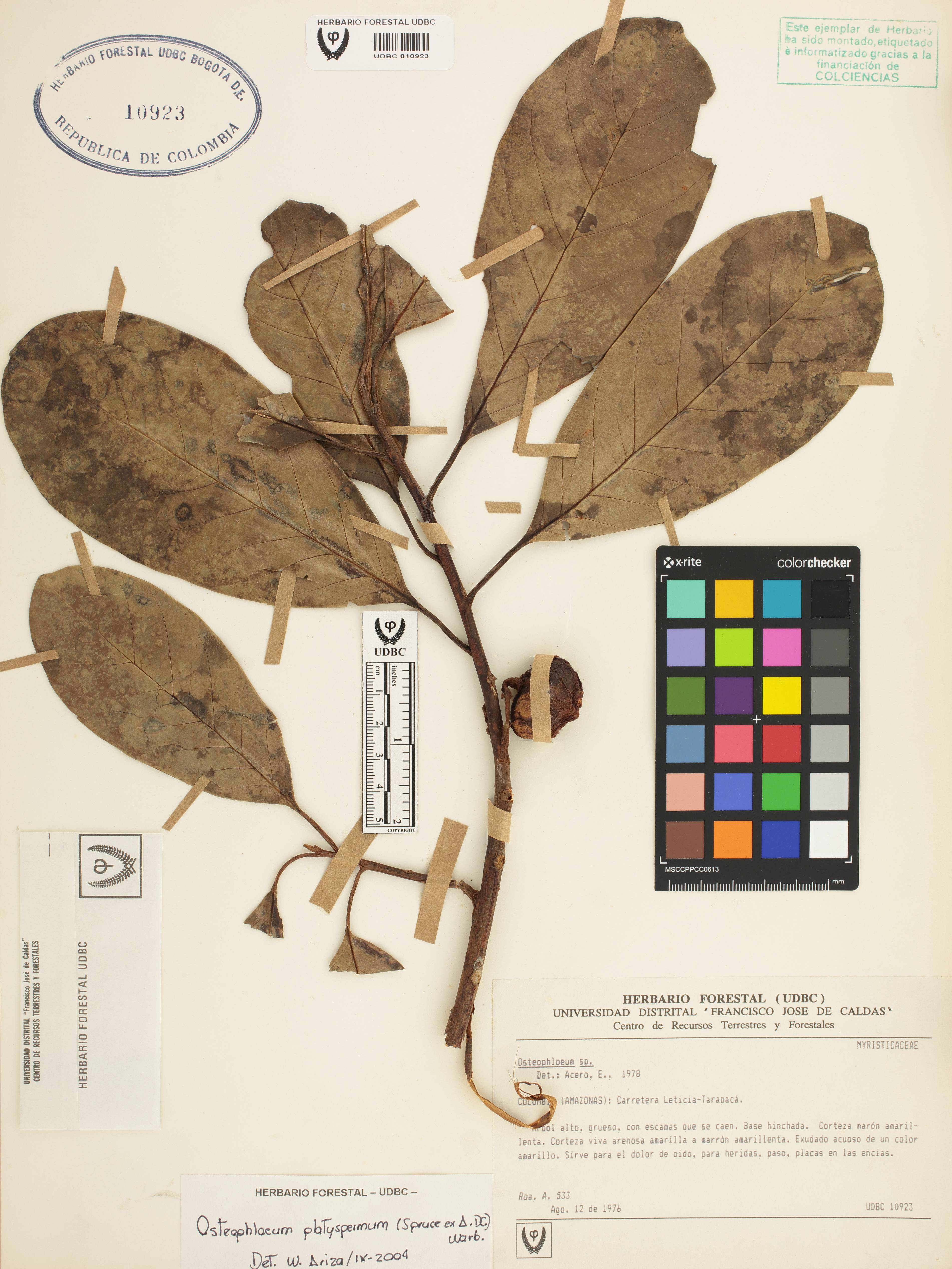 Fotografía del ejemplar Roa, A. 533, determinado como Osteophloeum platyspermum en el año 2004
