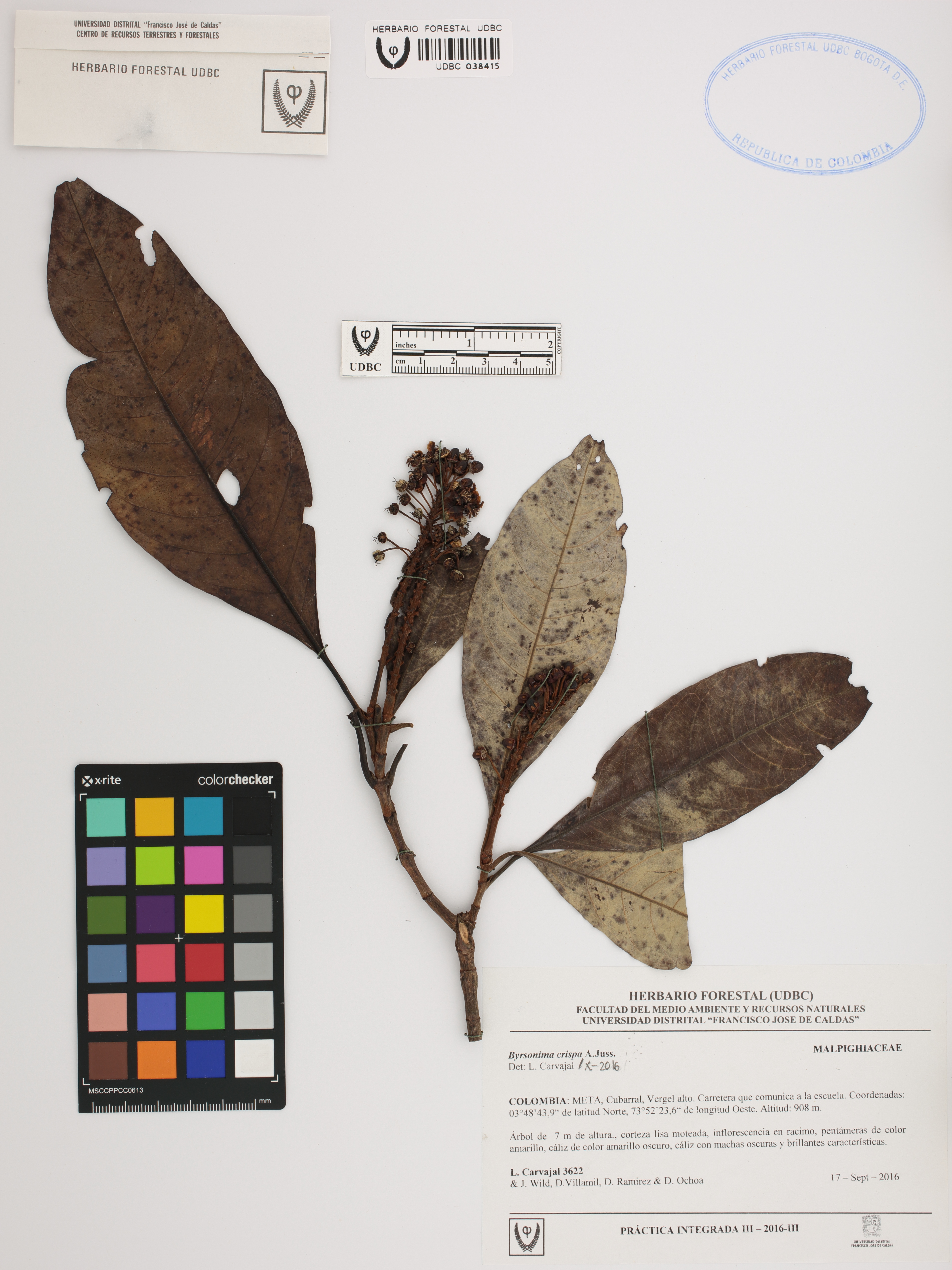 | dc.description | Fotografía del ejemplar Carvajal, L. 3622, determinado como Byrsonima crispa en el año 2016 | |