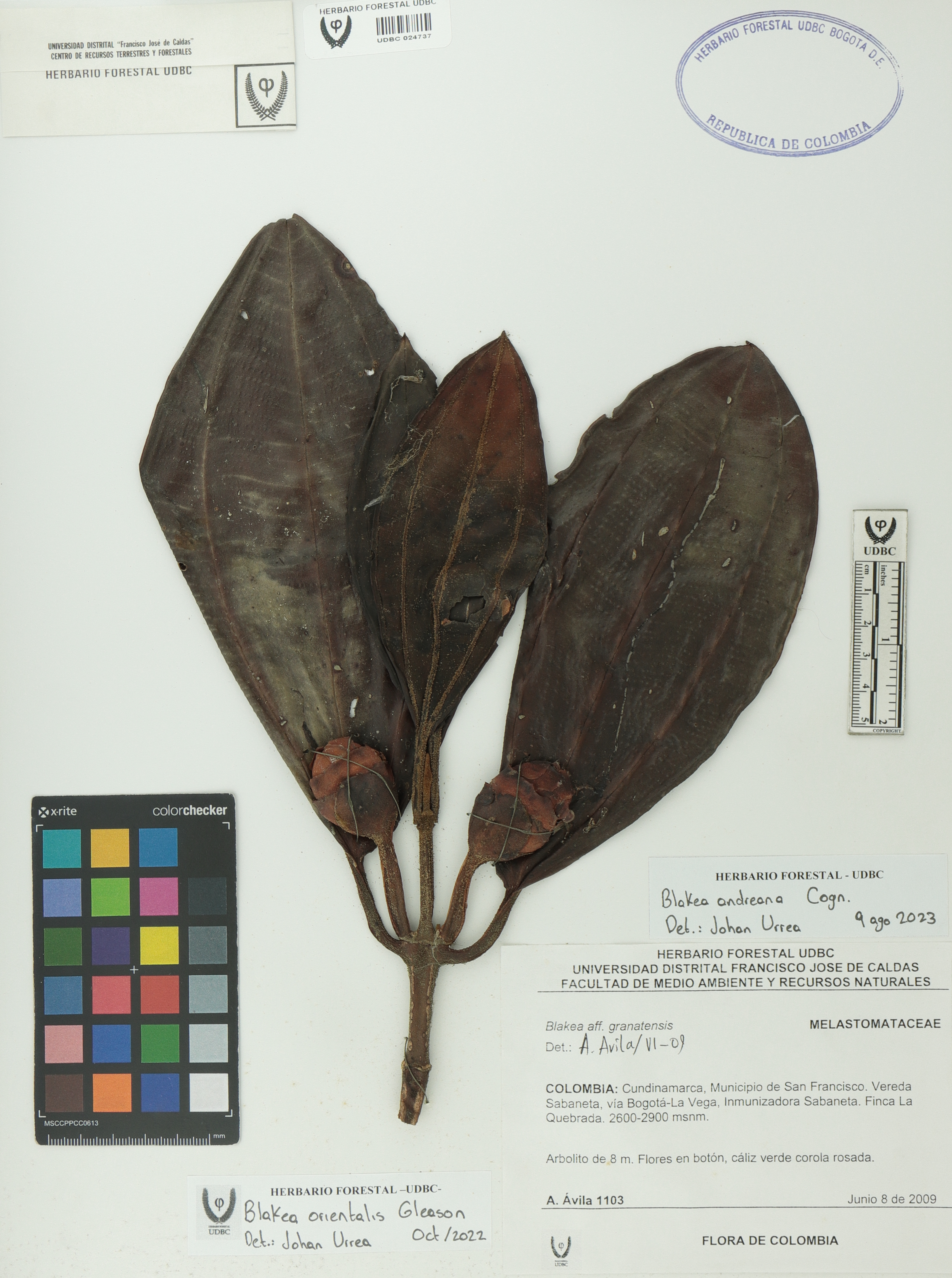 Fotografía del ejemplar Ávila, A. 1103, determinado como Blakea andreana en el año 2023
