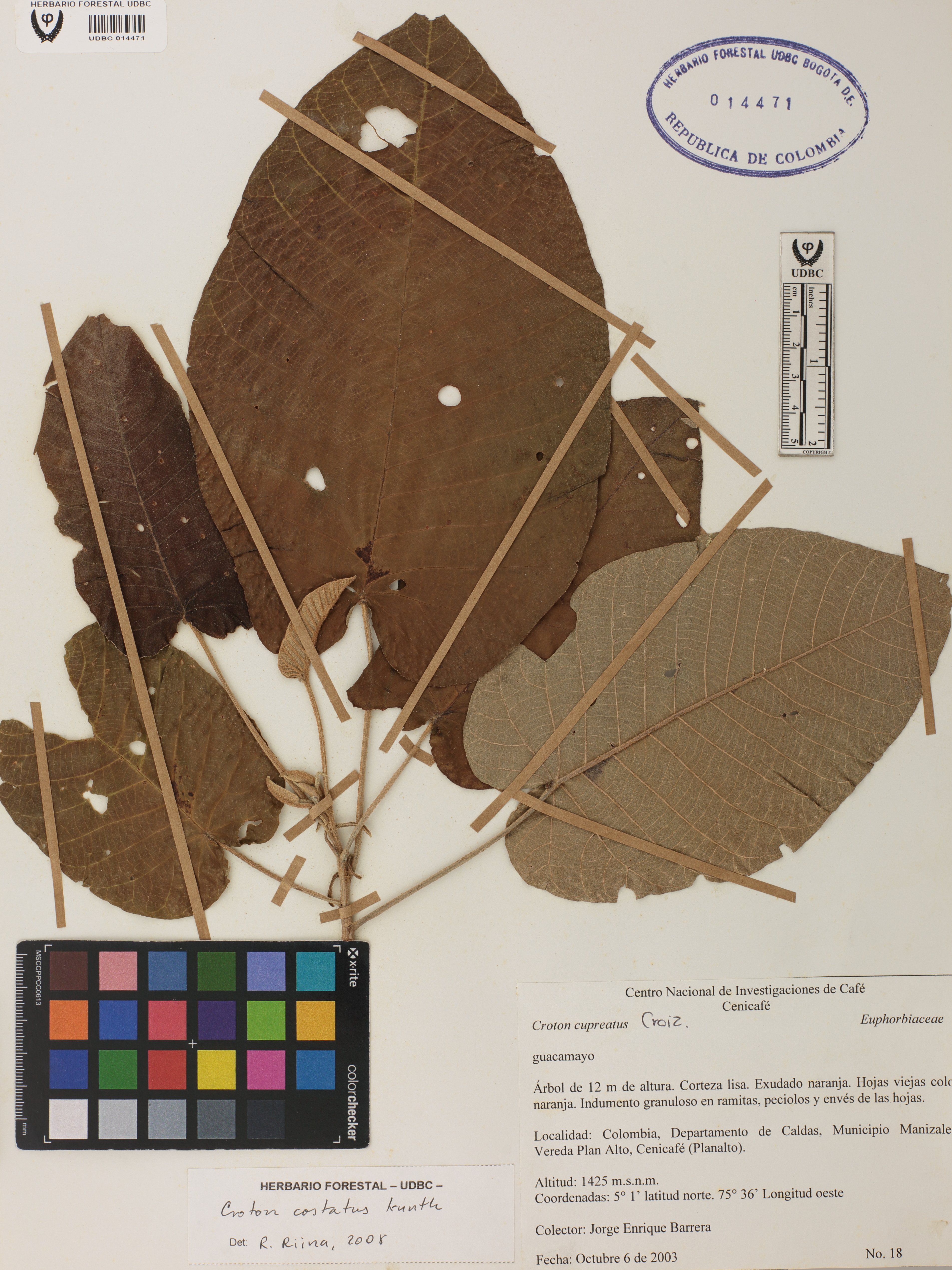 Fotografía del ejemplar Barrera, J. 18, determinado como Croton costatus en el año 2008