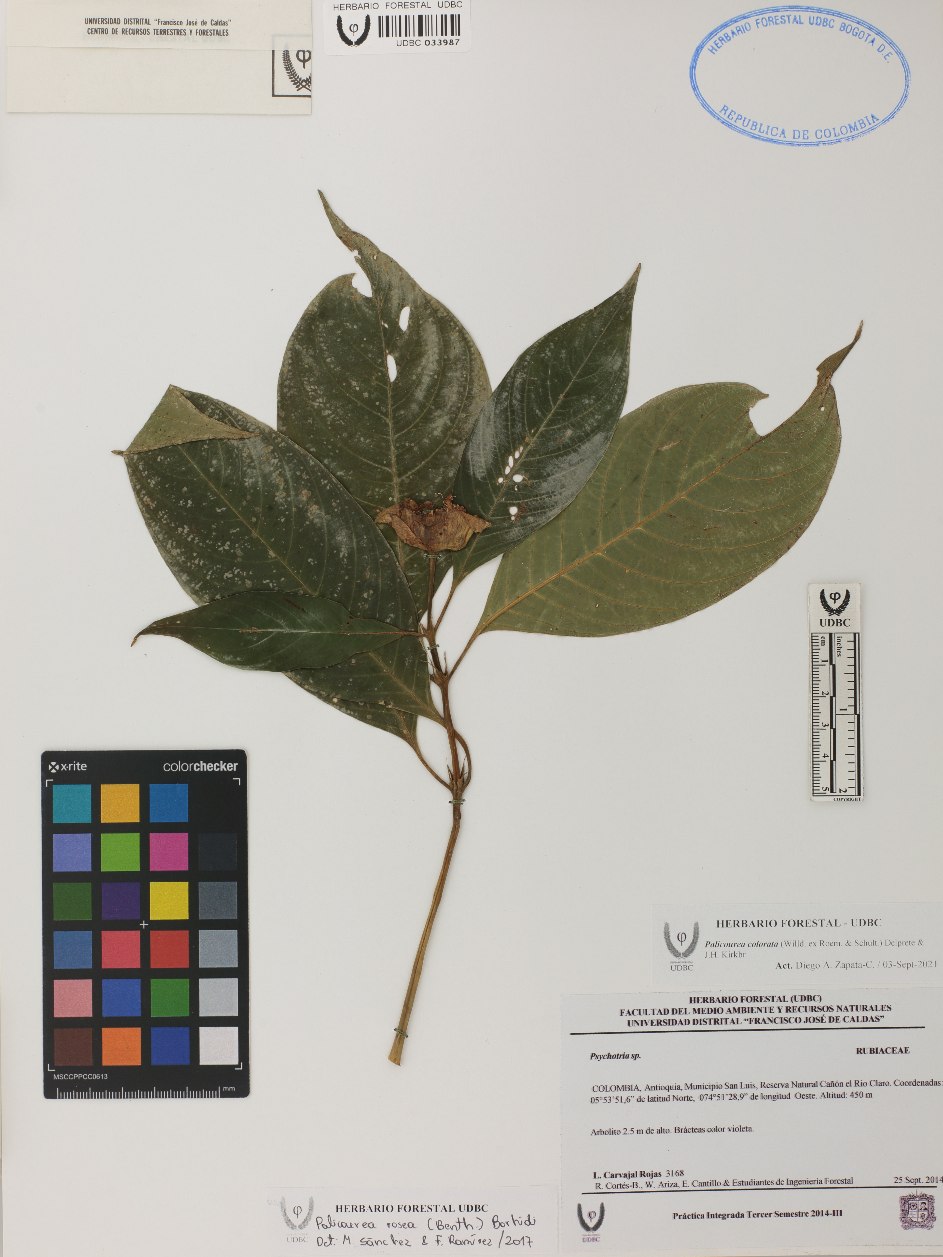 Fotografía del ejemplar Carvajal, L. 3168, determinado como Palicourea colorata en el año 2017