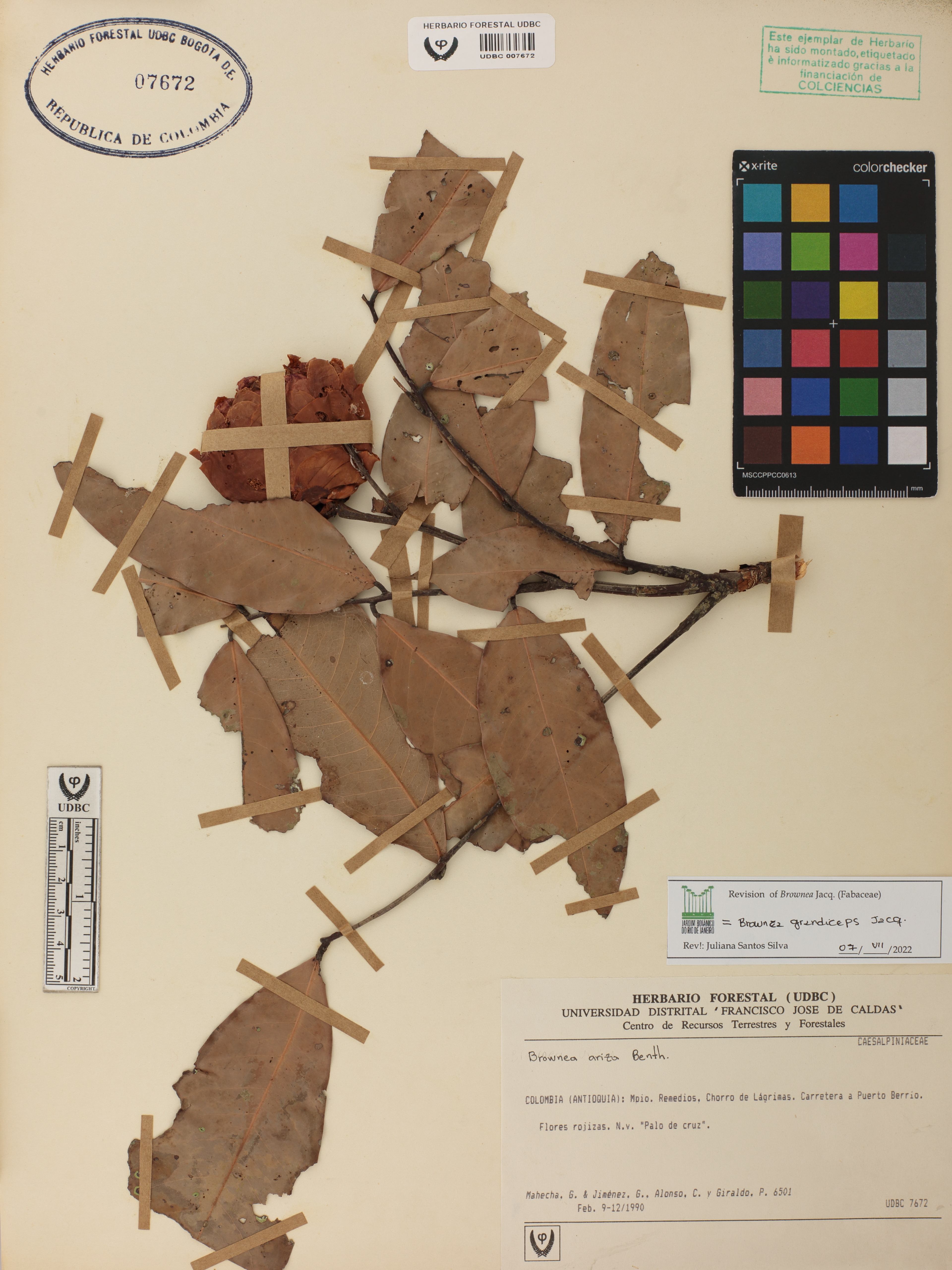 Fotografía del ejemplar Mahecha, G. 6501, determinado como Brownea grandiceps en el año 1990