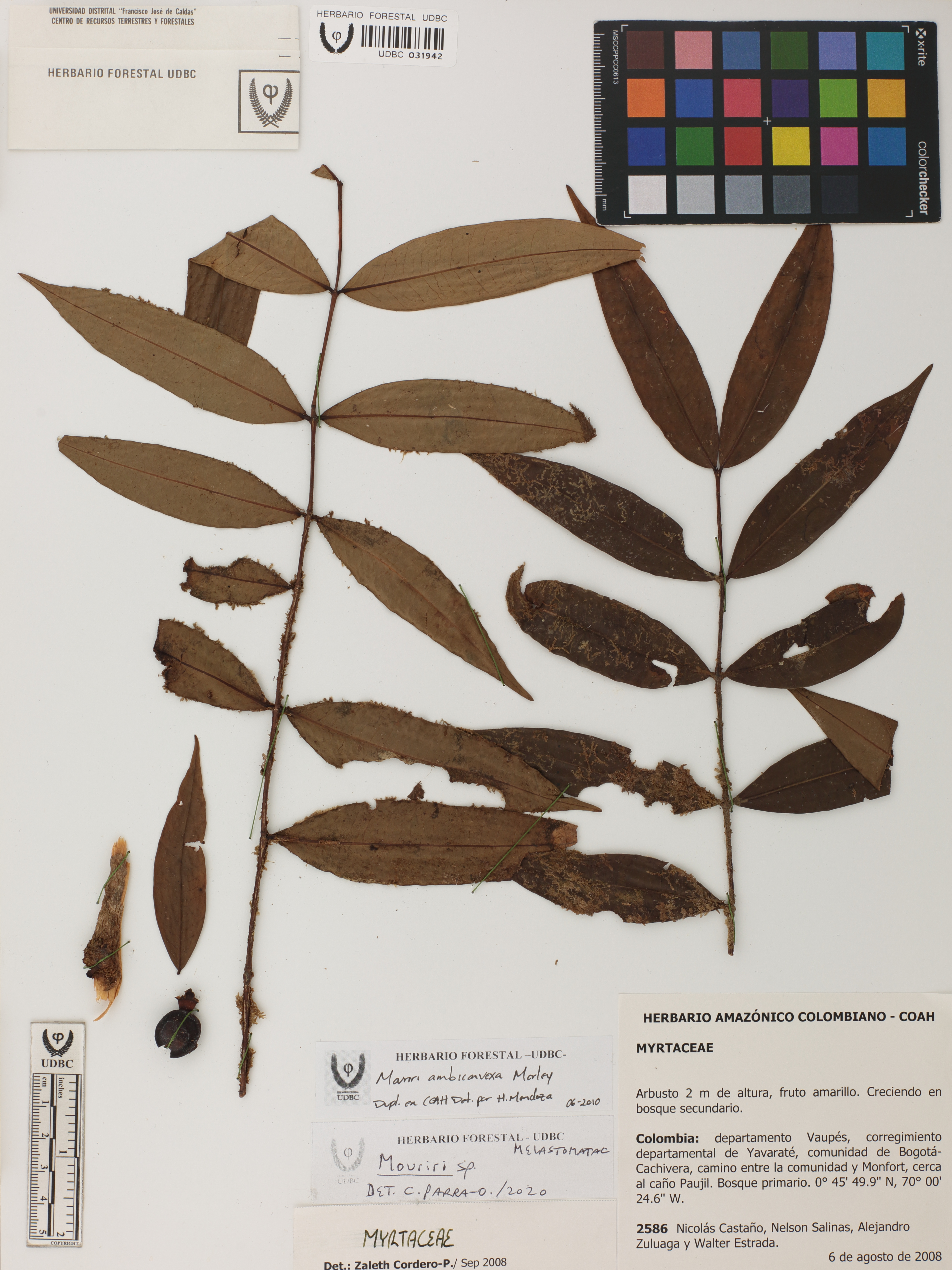 Fotografía del ejemplar Castaño, N. 2586, determinado como Mouriri ambiconvexa en el año 2010