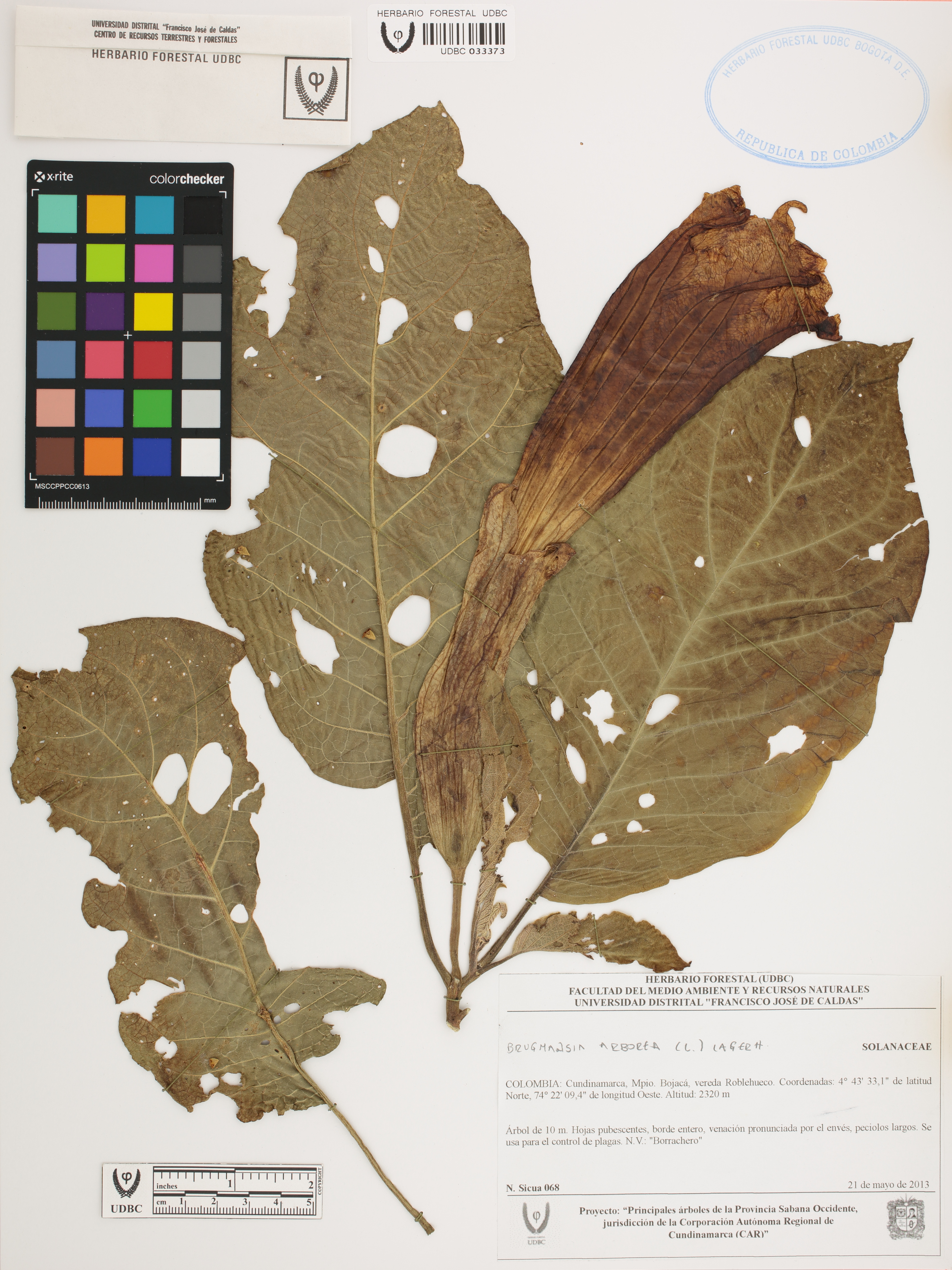 Fotografía del ejemplar Sícua, N. 68, determinado como Brugmansia arborea