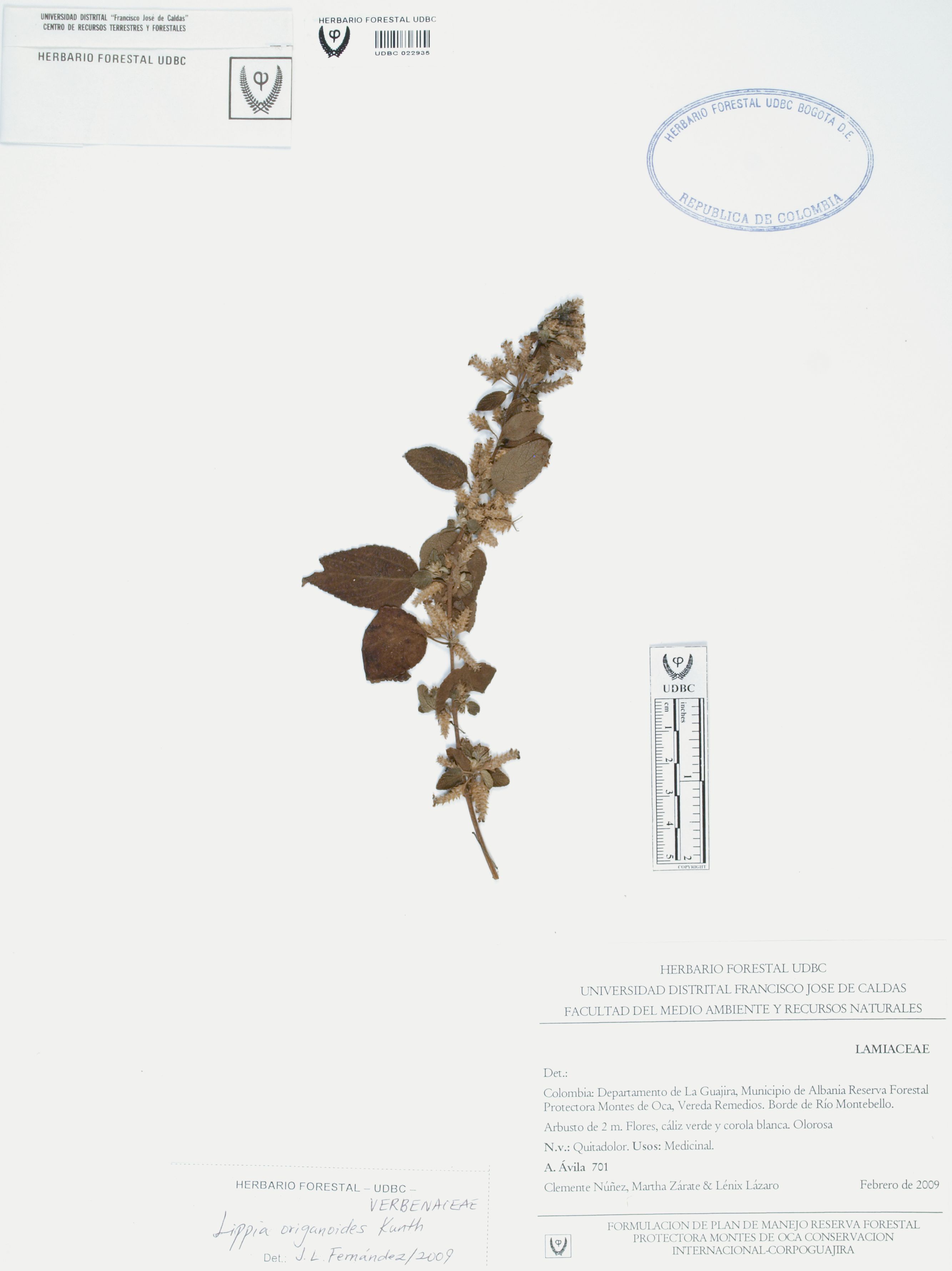Fotografía del ejemplar Ávila, A. 701, determinado como Lippia origanoides en el año 2009