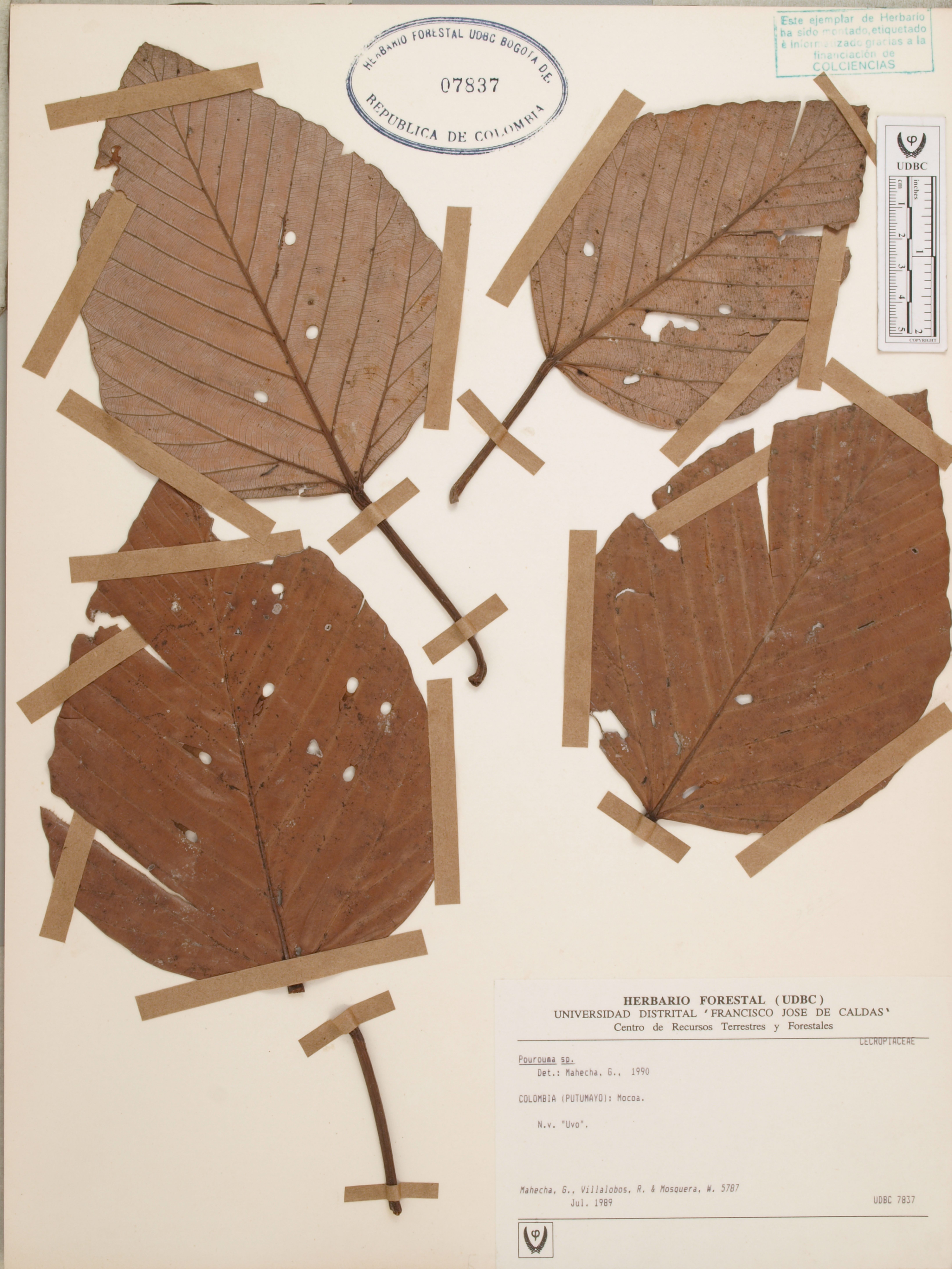 Fotografía del ejemplar Mahecha, G. 5787, determinado como Pourouma sp. en el año 1990